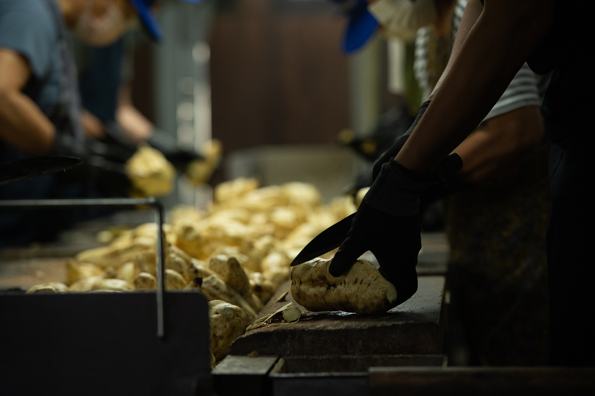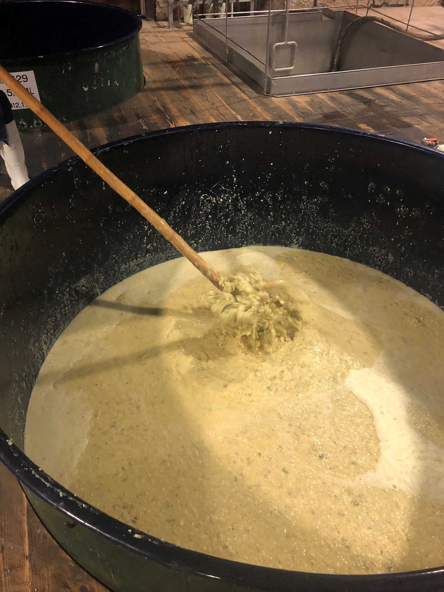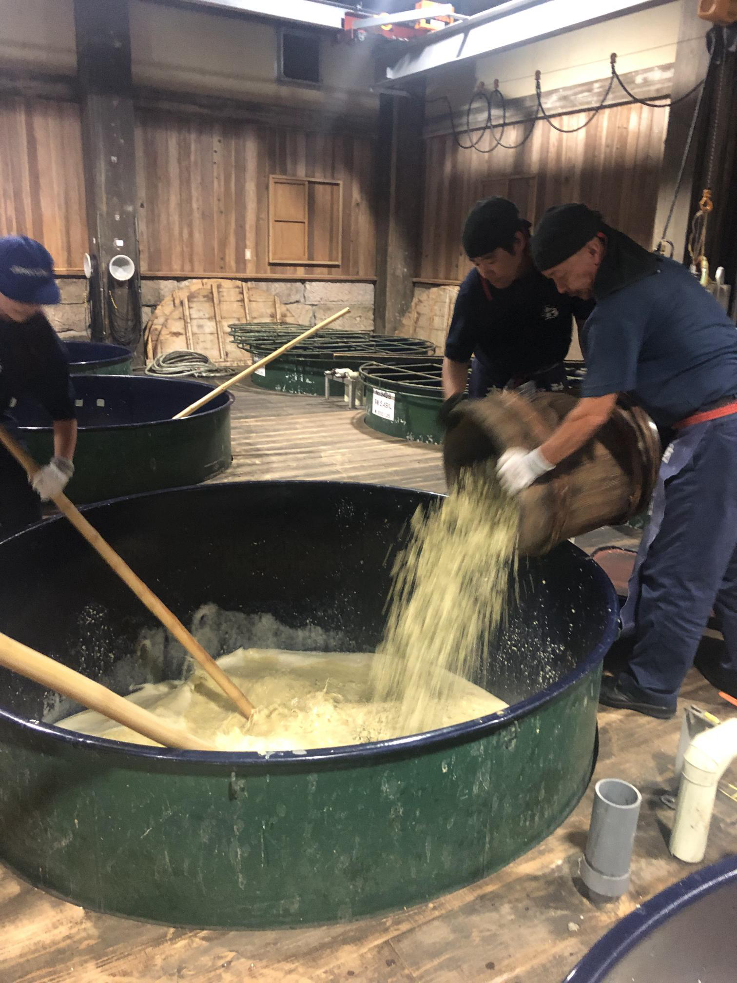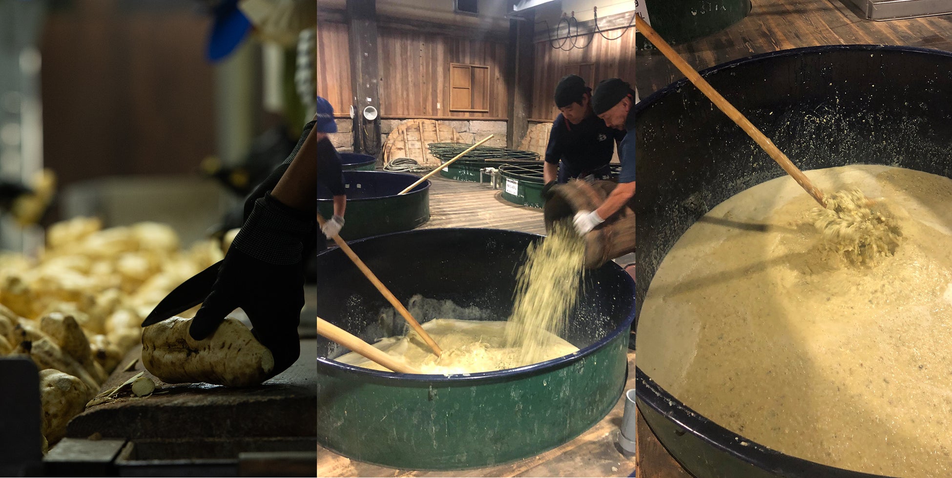 現在主流の二次仕込み法と異なり、原料を同時に仕込み容器に入れるため仕込み直後は非常に固く、かき混ぜるための かい棒 が入らないほどです。また、クエン酸を造らない黄麹を使用することにより、温暖な鹿児島では腐敗させずに焼酎として仕上げることが難しい製法でした。