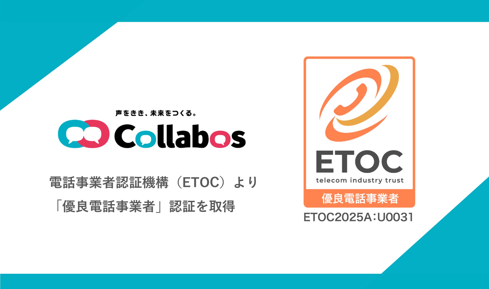 コールセンターシステムやマーケティングシステムを月額制のクラウド型で提供している株式会社コラボス(本社:東京都千代田区、代表取締役社長:茂木 貴雄、以下「コラボス」)は、2025年2月1日付けで、電話サービスを提供する電気通信事業者の評価認証を行う電話事業者認証機構(Elite Telecom Operator Certification body, ETOC、以下「ETOC」)より、優良電話事業者の認証を取得しました。