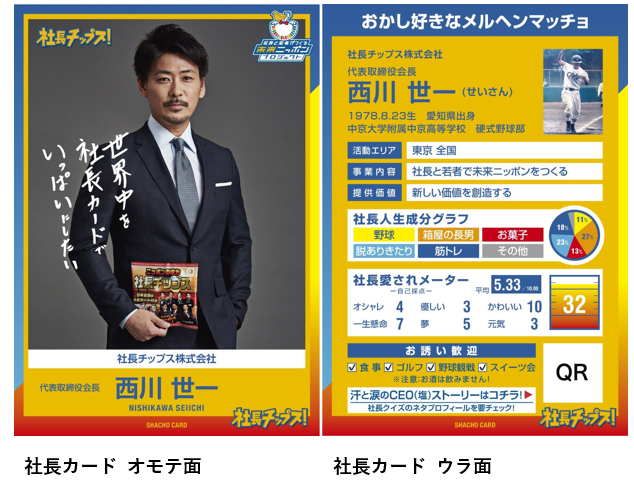 2016年にスタートした社長のカード付きチップスをきっかけにしたPRサービス「社長チップス!」を今月リニューアル。新しくキャッチコピーを「社長と若者の夢ポケット」、活動テーマを「社長カードでつながる経済活動」と設定し、ユニークなビジネスコミュニケーションを生み出すサービスをスタートさせました。