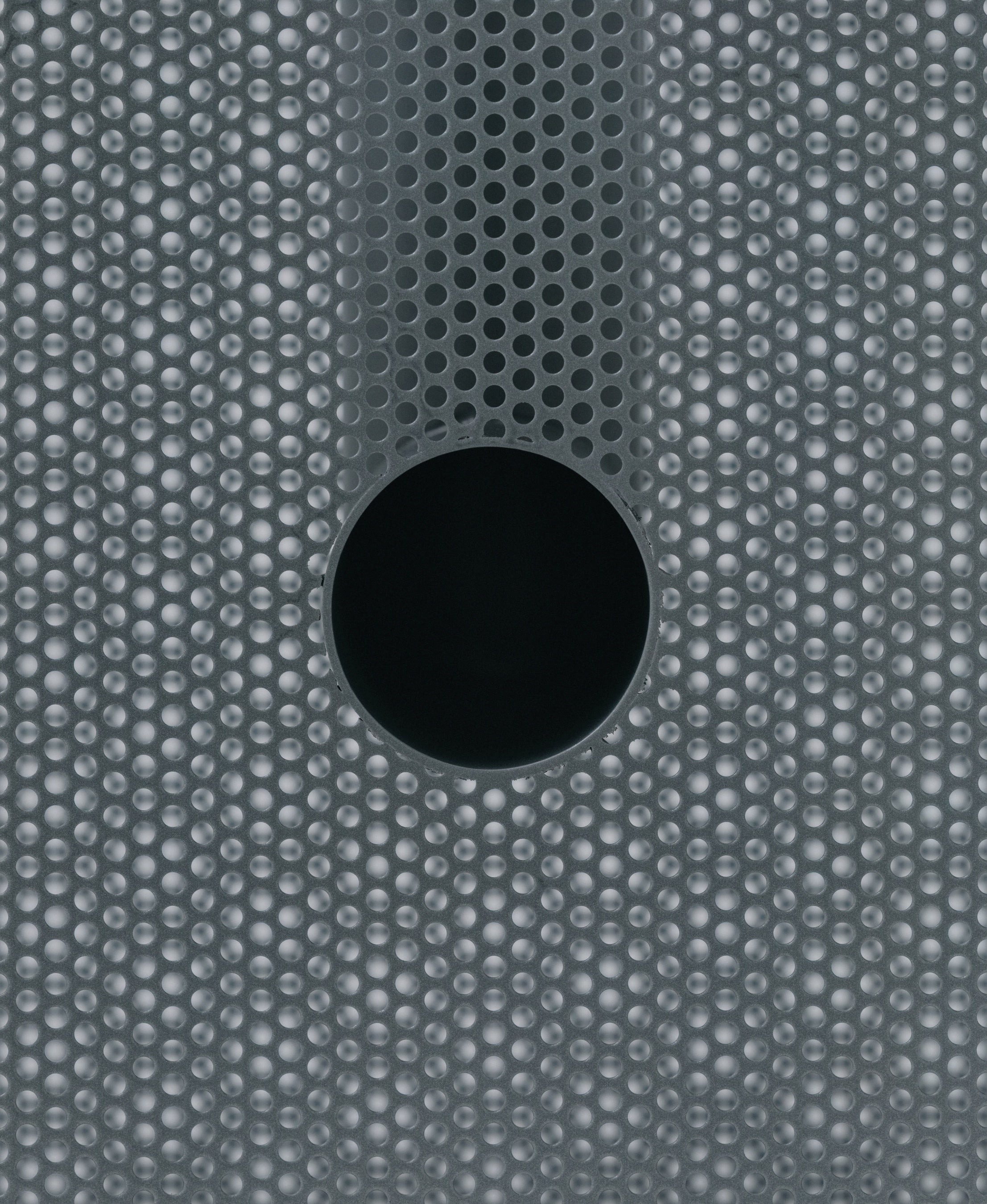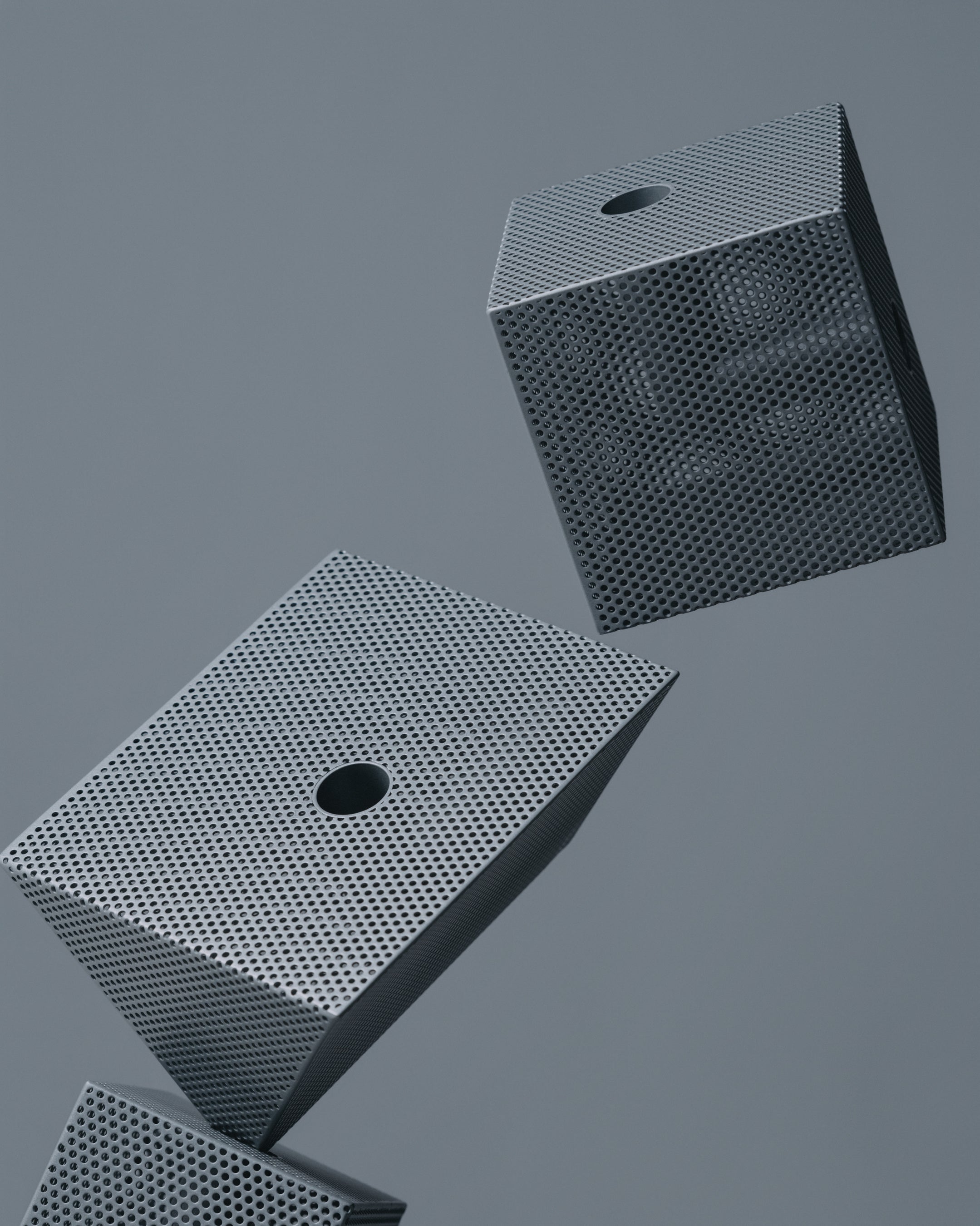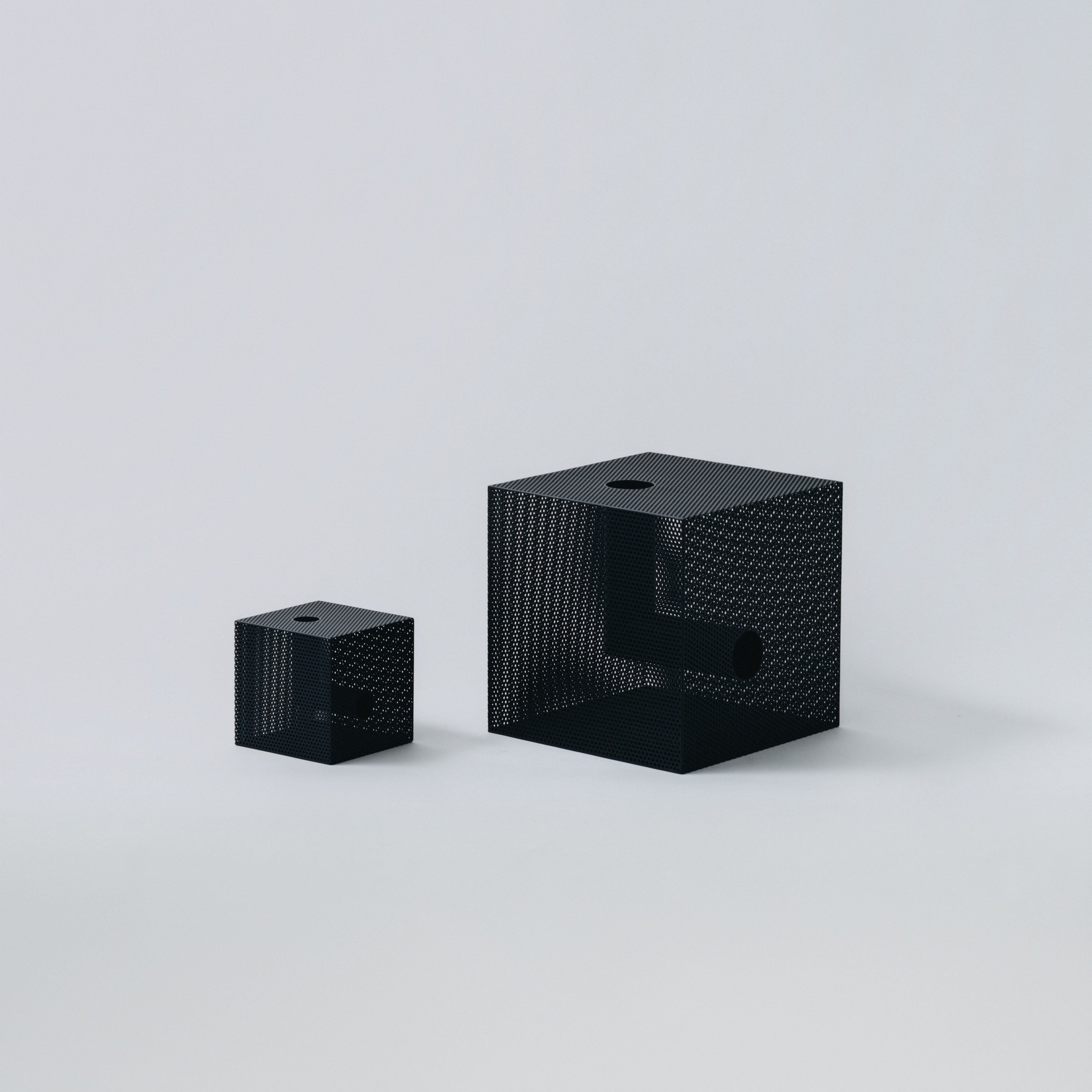 パンチングメタルは本来、軽量化や通気性など機能性を目的に発展してきた素材ですが、見る角度や光によって印象が変わる曖昧さも併せ持ちます。「Punching Block(パンチングブロック)」では、その機能ではなく“見え方の揺らぎ”に着目し、箱状に組んだパンチングメタルにL字型パイプを貫通させた構成としました。高精度な板金・溶接技術と均一な塗装によって、外観は塊として立ち上がりながら、内部構造が光や視点によって断片的に現れます。