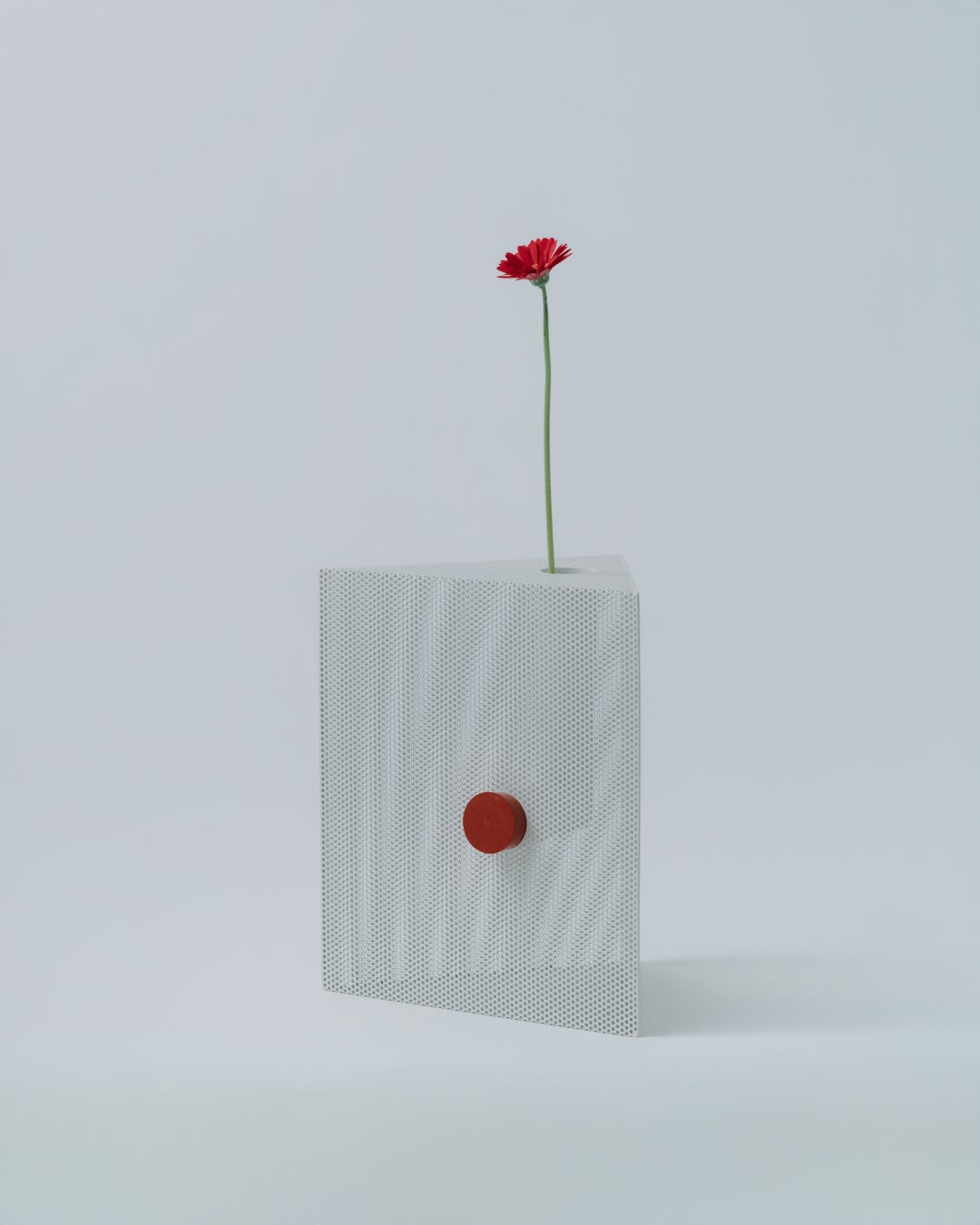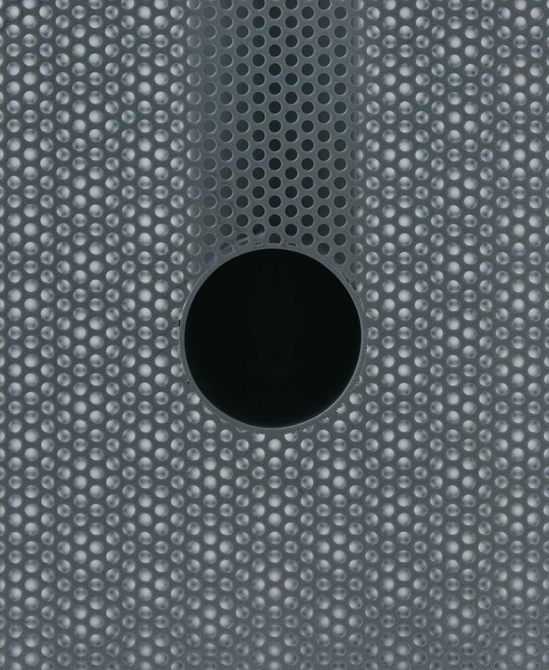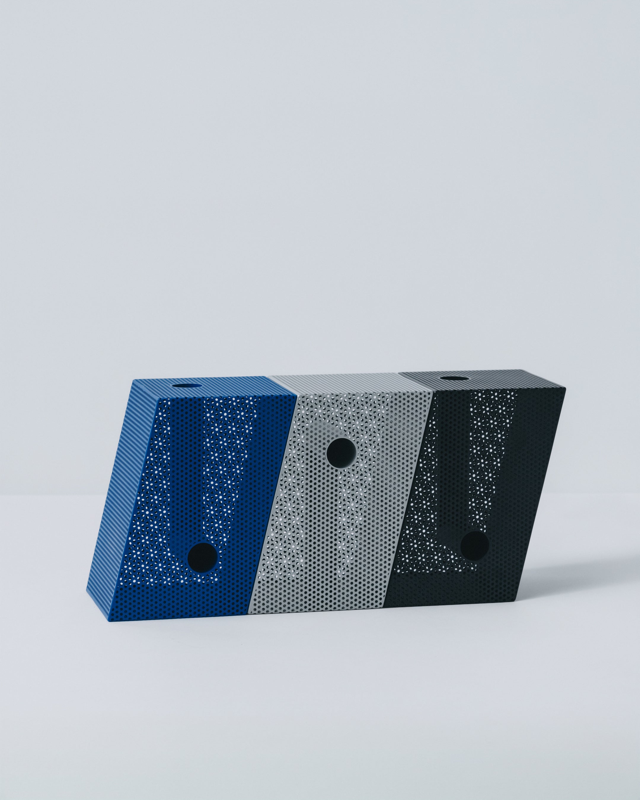 パンチングメタルは本来、軽量化や通気性など機能性を目的に発展してきた素材ですが、見る角度や光によって印象が変わる曖昧さも併せ持ちます。「Punching Block(パンチングブロック)」では、その機能ではなく“見え方の揺らぎ”に着目し、箱状に組んだパンチングメタルにL字型パイプを貫通させた構成としました。高精度な板金・溶接技術と均一な塗装によって、外観は塊として立ち上がりながら、内部構造が光や視点によって断片的に現れます。