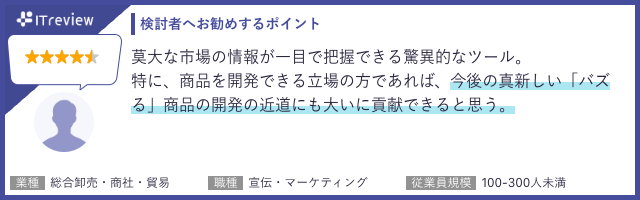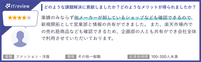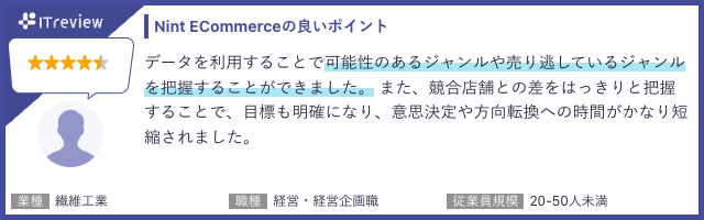 頂きましたレビュー内では商品開発から、販売商品の選定、販売施策など様々なシーンの中で合理的な判断を頂くにあたり欠かせないツールとして「Nint ECommerce」をご活用頂いているなどご意見を多数頂戴いたしました。