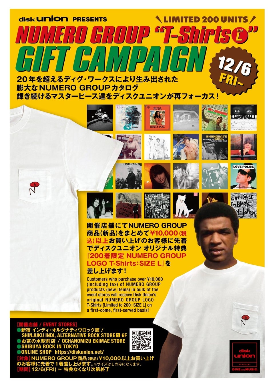 12/6(FRI)~開催店舗にて、NUMERO GROUP商品(新品)をまとめて¥10,000(税込) 以上お買い上げのお客様に、先着でディスクユニオンオリジナル特典【200着限定 NUMERO GROUP LOGO T-Shirts : SIZE L】を差し上げます!