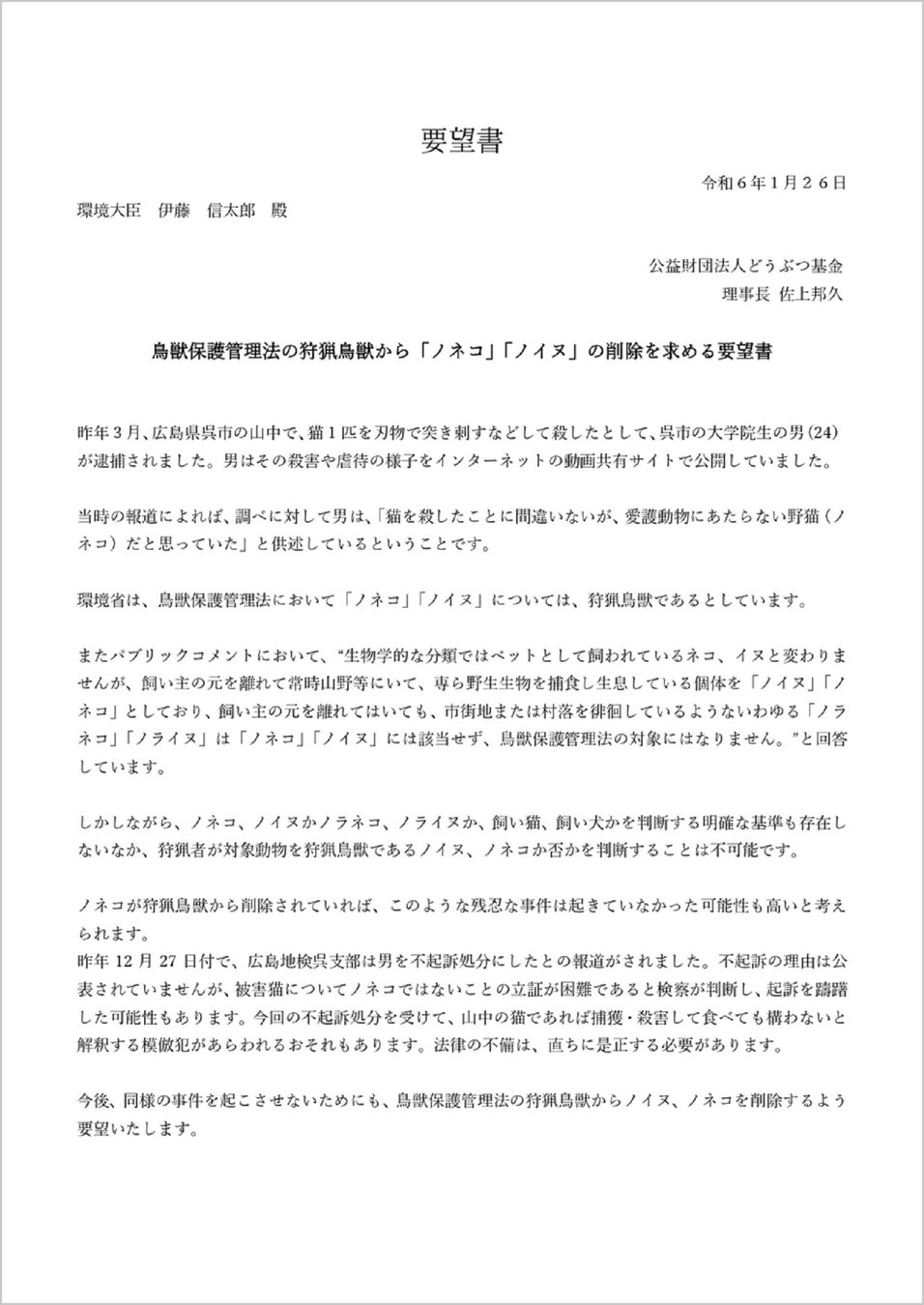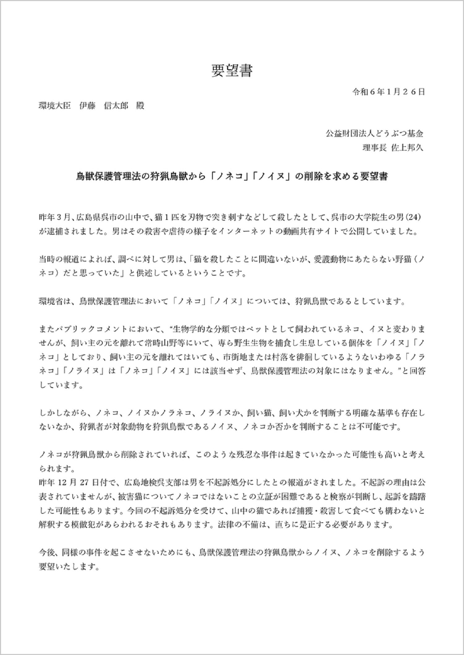 2023年1月26日、公益財団法人どうぶつ基金(以下「どうぶつ基金」)は、伊藤信太郎環境大臣宛に「鳥獣保護管理法の狩猟鳥獣から「ノネコ」「ノイヌ」の削除を求める要望書」と署名47,284筆を一次提出いたしました。