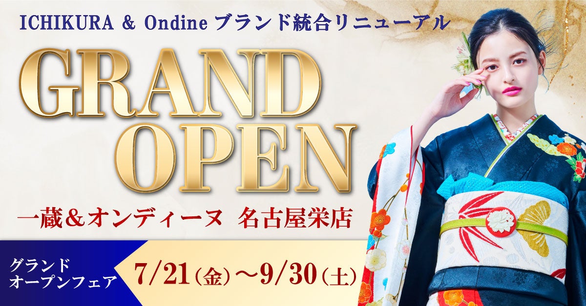 一蔵の2大振袖専門店「ICHIKURA」「オンディーヌ」は、全国に約70店舗を展開しており、呉服等の販売や、振袖の販売・レンタル等を行っております。この度、移転オープンをいたします「名古屋栄店」は、“永遠に輝く最高の瞬間” をテーマとした「ICHIKURA」と、“あなたらしく、自由に” をテーマとした「オンディーヌ」、両方の商品を見ることができる併設店です。