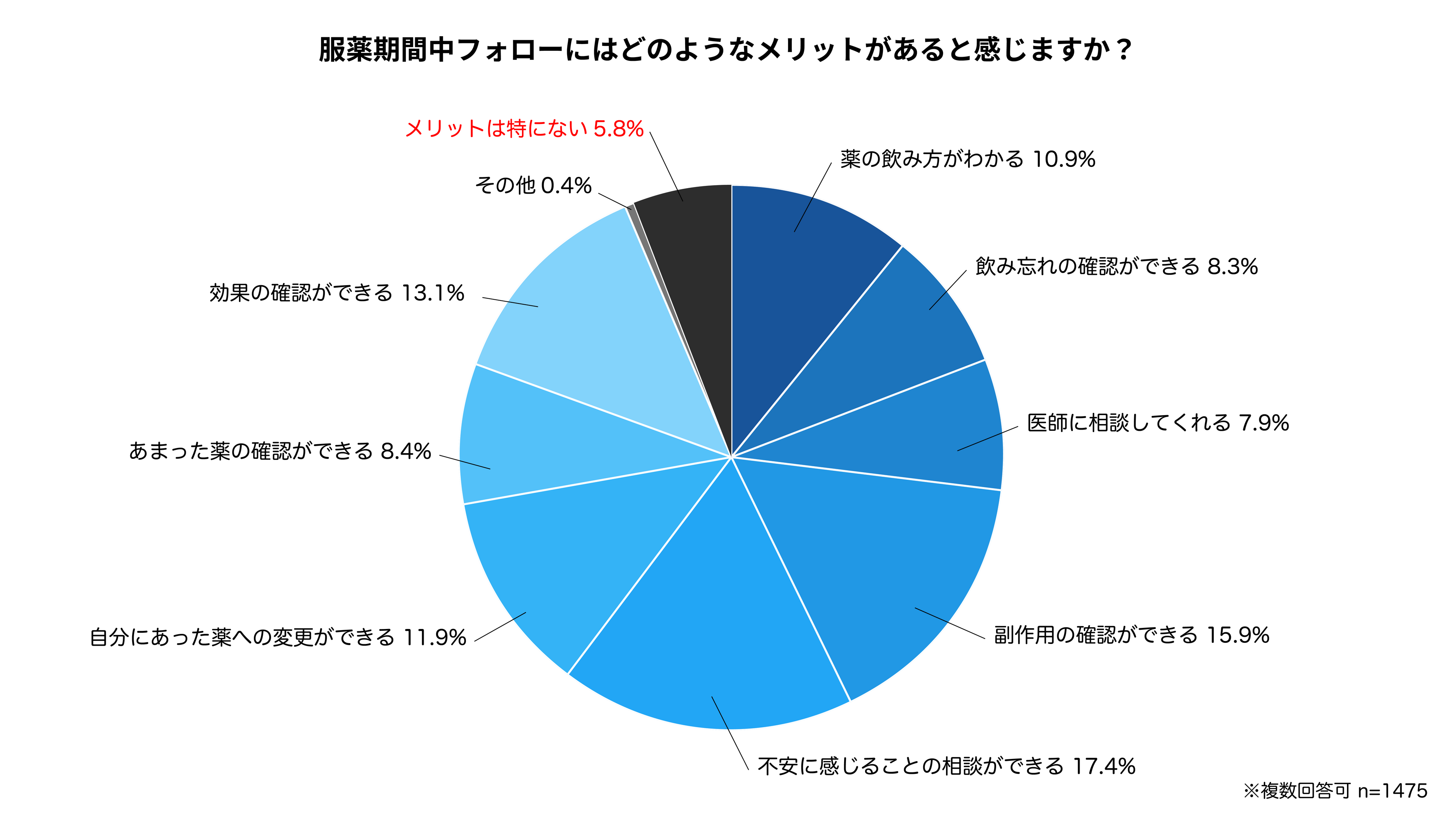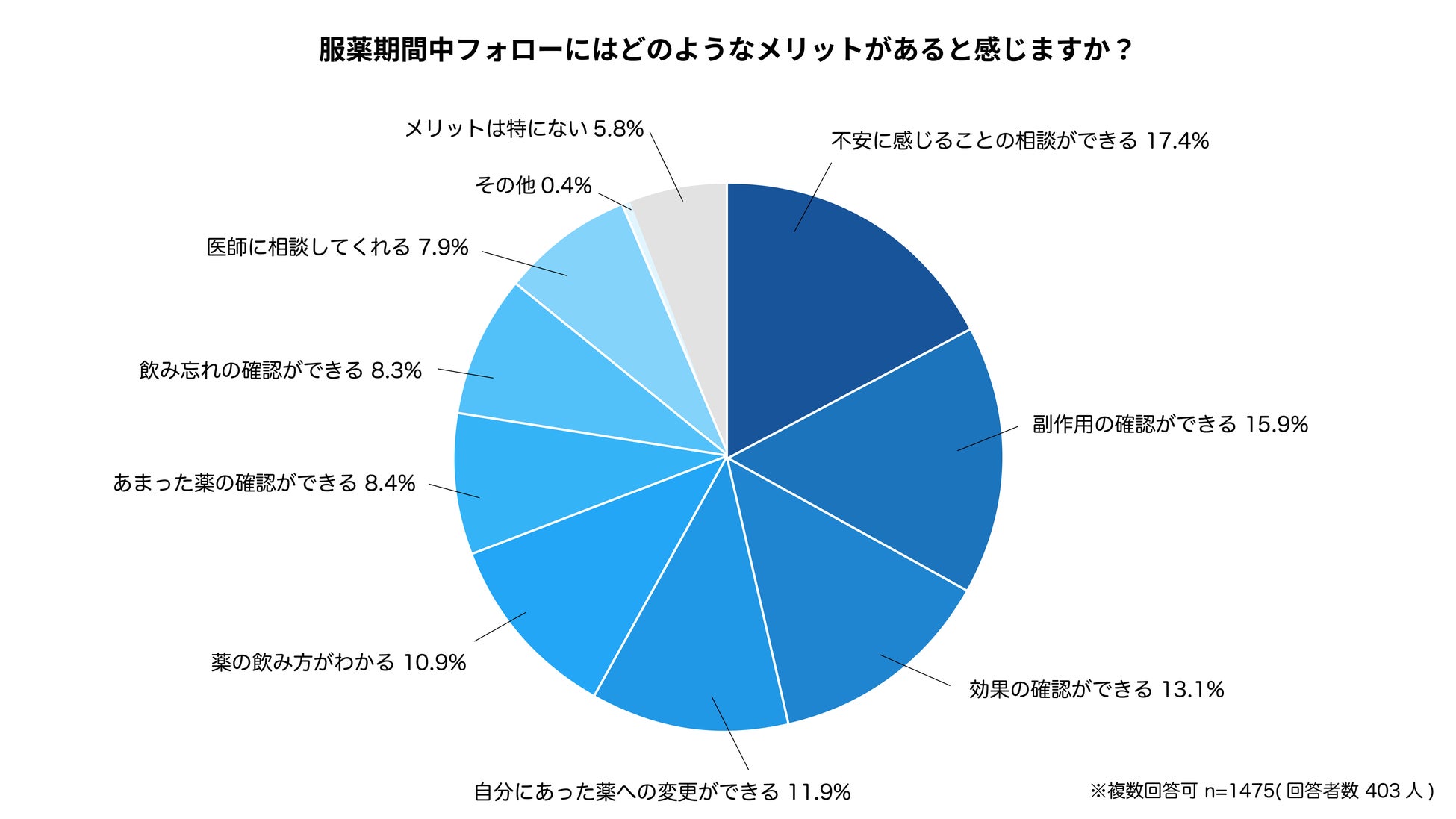また、言葉を認知している約4割の回答者に対し、服薬期間中フォローのメリットを複数回答で尋ねると、副作用や服用方法の相談ができる点など、何らかの有益性を感じている回答が94.2%を占めました。
