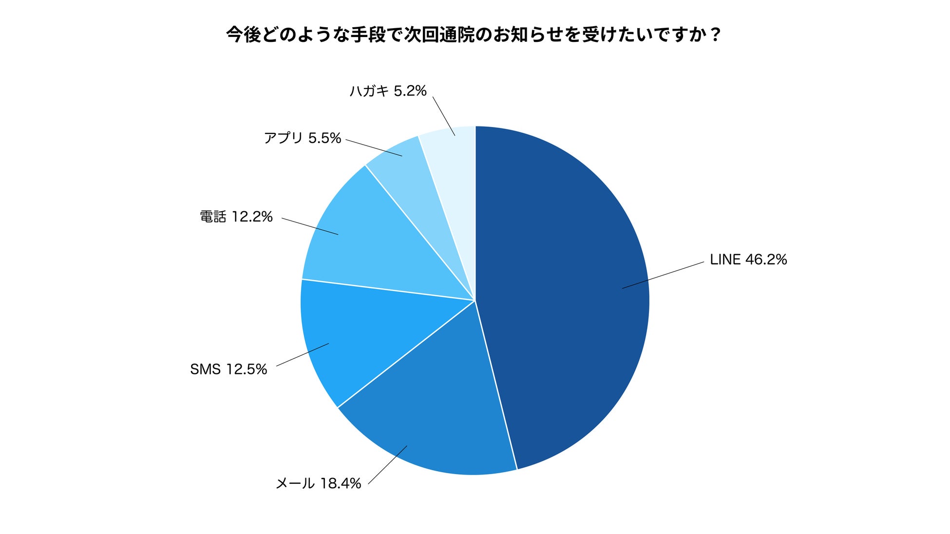 次回の通院日時を知らせる手段としてコミュニケーションアプリ「LINE」を選んだ人の割合が46.2%と半数近くを占めました。