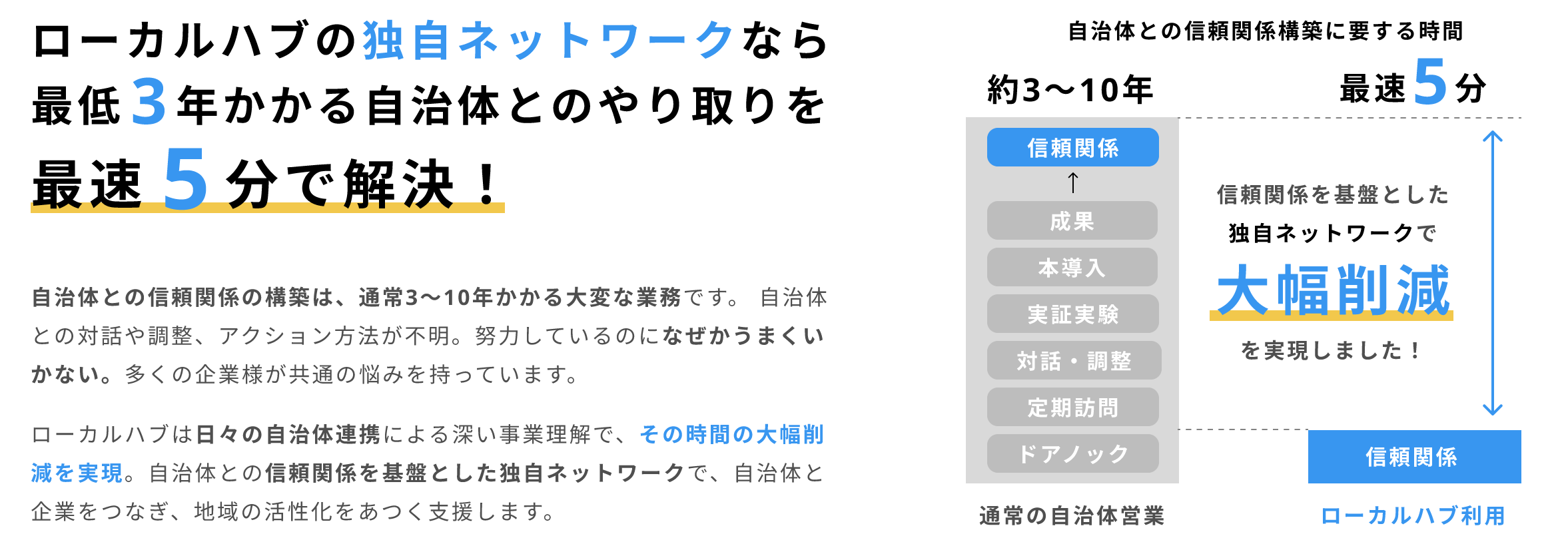 自治体ビジネスに必要なのは「信頼関係」です。民間企業が「話を聞いてもらえる関係値」を構築するには、かなりの時間を要します。ローカルハブは、全国各所の自治体との地域課題解決にかかる協定事業により、常に自治体へ「ただ一方的に送るだけではない」情報提供できる独自のネットワークを構築しております。これにより「一定の信頼関係の枠組みの中」で貴社事業の情報を自治体にお届けすることができます。