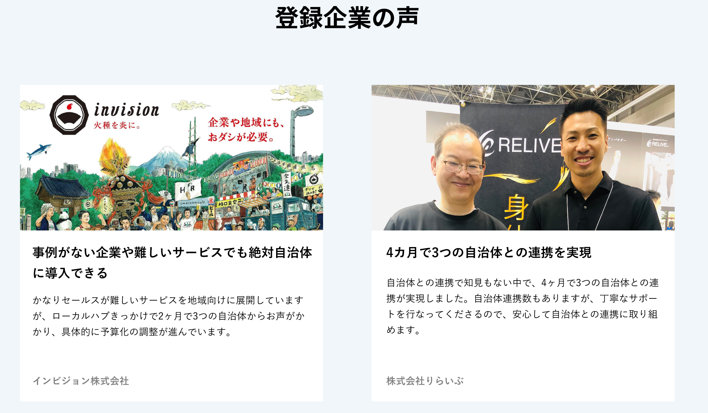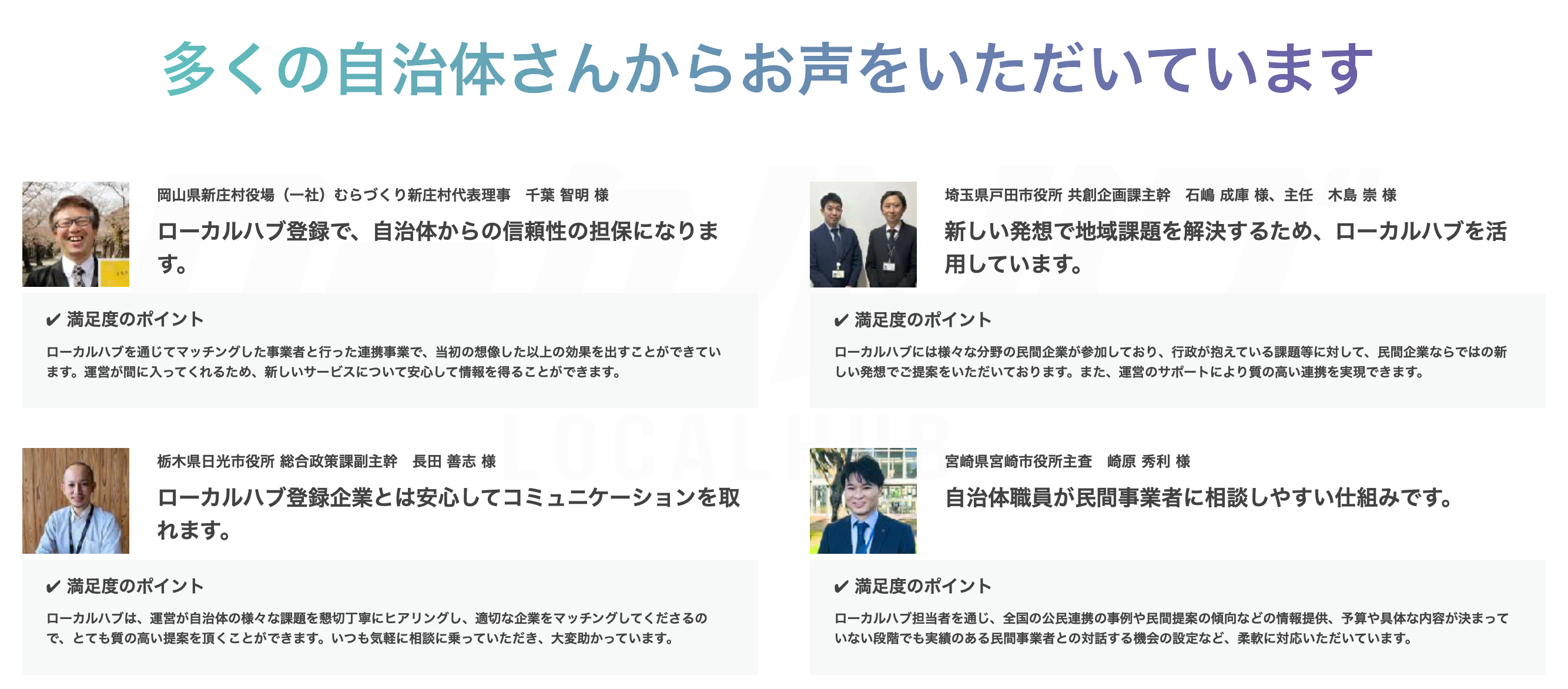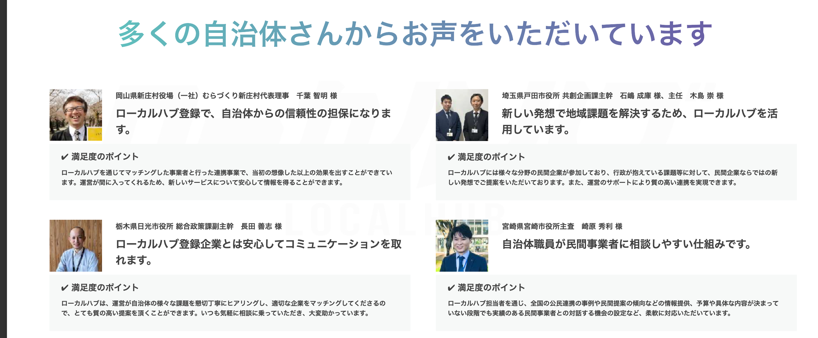 2022年05月29日にβ1.0版をリリース以降全国各所の自治体様に参画いただき、企業との連携をサポート/ご支援させていただきました。多くの自治体様に新規事業の検討、既存事業の見直し、発注先の比較検討の際にお役立ていただき、確かな信頼関係を以てローカルハブをご利用いただいております。ローカルハブの独自ネットワークに参画いただく自治体様も随時拡大中で、今後さらに拡大していく予定です。