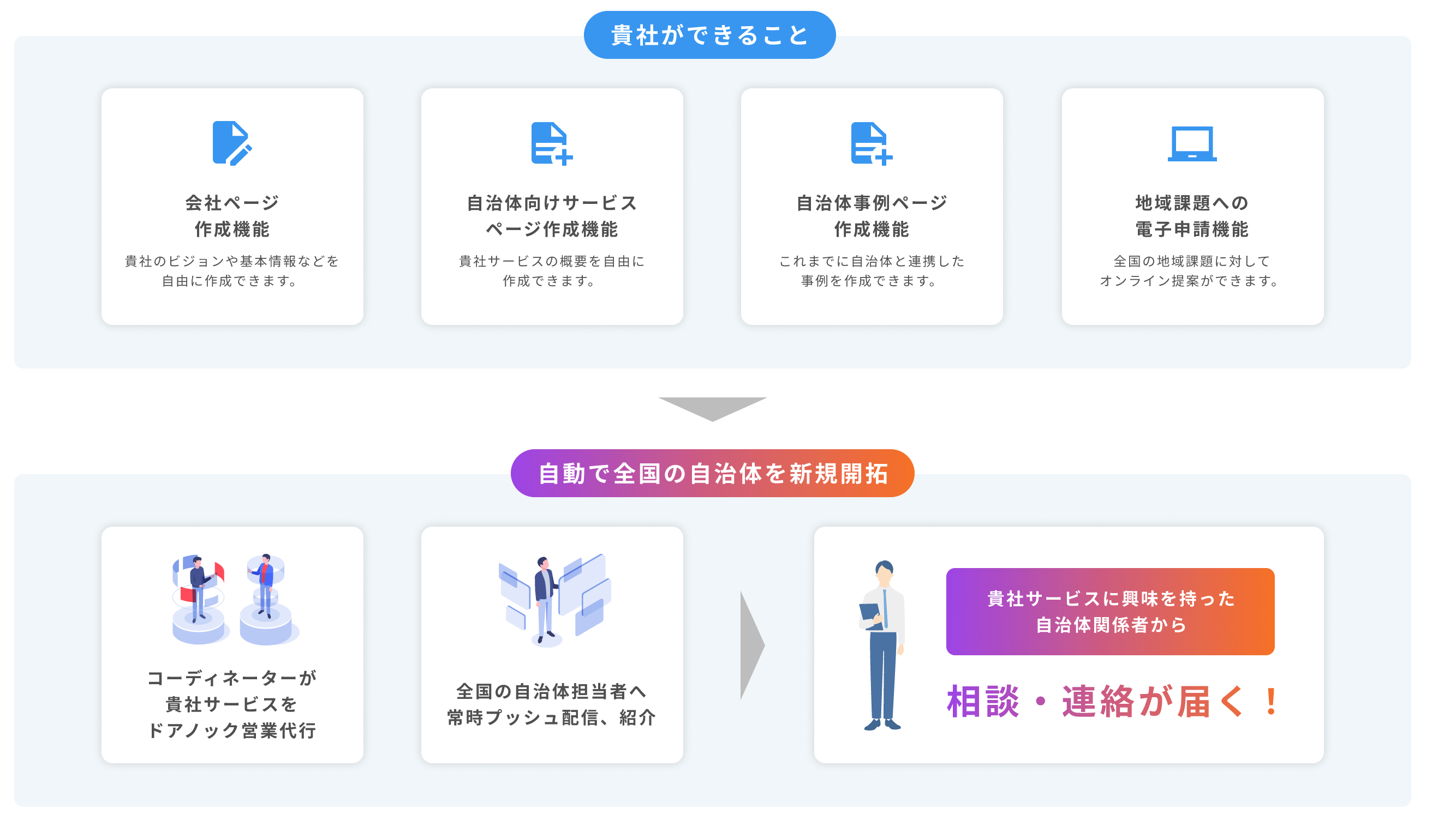 ・自治体向けサービスページ作成機能:貴社サービスページを自由に作成できます。