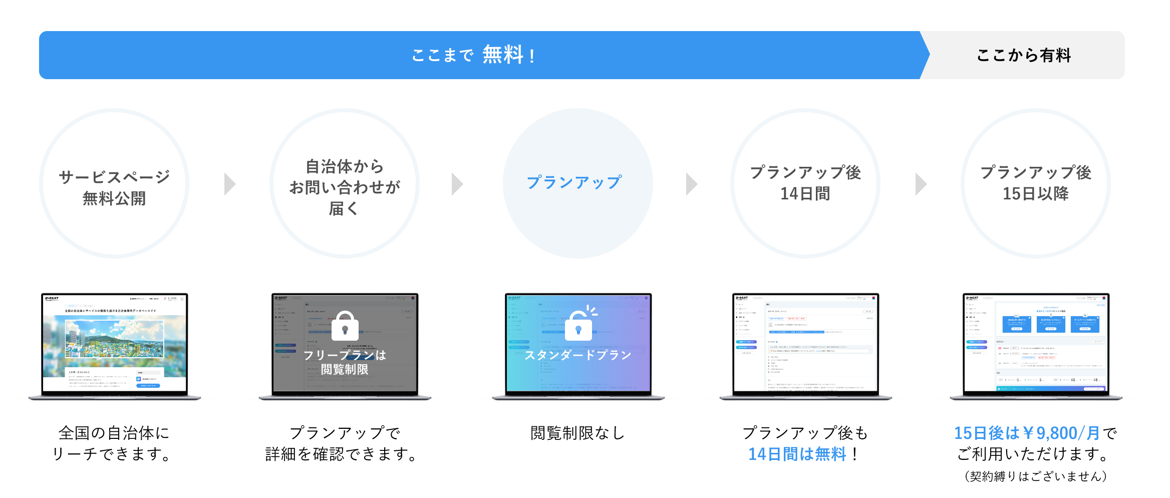 全機能を無料でお試しいただけますので、テストマーケティングにお役立ていただけます。自治体職員や関係者からお問合せがあった際、お問合せ内容をご確認いただく際にスタンダードプランへお申し込みいただく必要があります。※スタンダードプランは14日間無料でご利用いただけます。