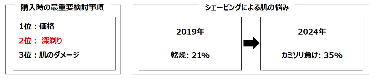 現代の男性のシェービング習慣は大きく変化しています。2024年の調査※1によると、57%の男性が電気シェーバーを使用しており、これは依然として大多数を占めています。一方で、シェービングによる肌の悩みを抱える男性が2019年の61%から2024年には74%へと増加していることが明らかになりました。特に、2024年には「カミソリ負け」(35%)が悩みの第一位に挙げられており、深剃りを追求するあまり肌に負担をかけている背景があります。また、電気シェーバーの購入時の最重要検討事項において、価格に次いで「深剃り」が最も重要な要素であるという結果もあります。