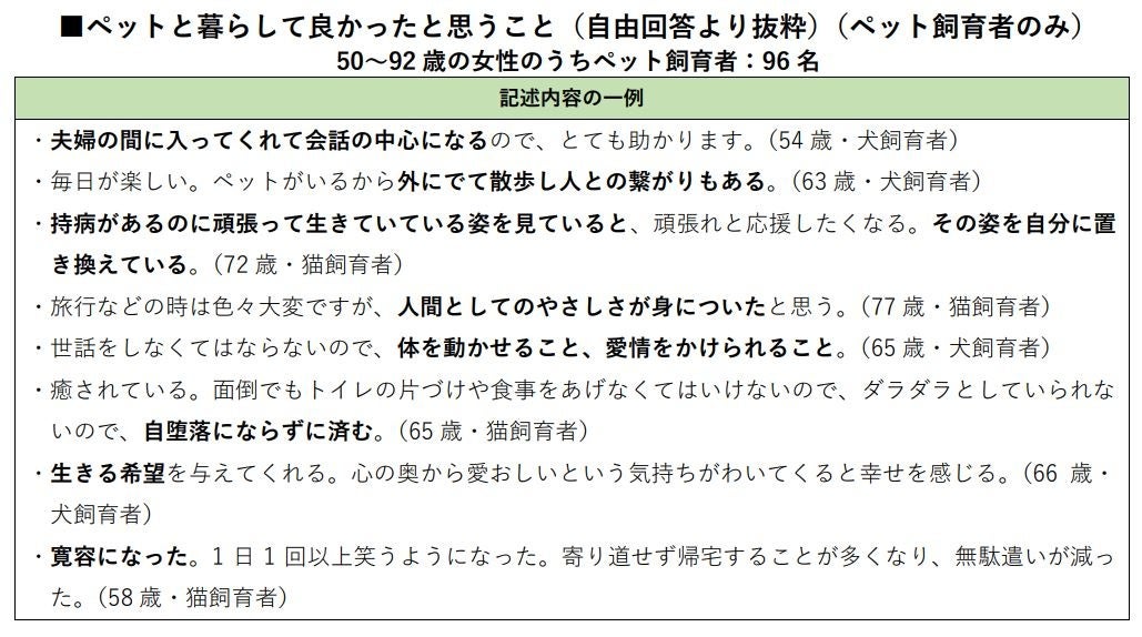 ⇒ペット飼育者がペットと暮らして良かったことは、「夫婦の間に入ってくれて会話の中心になる」「人とのつながりもできる」「持病があるのに頑張って生きている姿を自分に置き換えている」「人間としてのやさしさが身についたと思う」「自堕落にならずに済む」などの意見があがる。