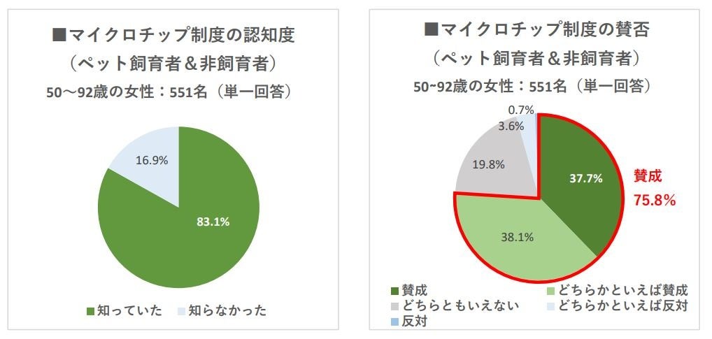 ・今年6月に施行された「犬と猫のマイクロチップ情報登録制度」についての認知度は、非飼育者も含めたシニア女性全体で 83.1%を占め、ペット飼育者では 94.8%に達する。
