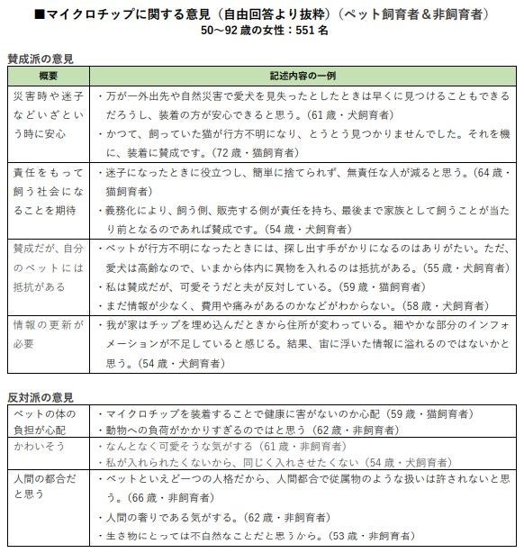 ・賛成派の理由としては、「災害時や迷子などいざという時に安心」「最後まで飼うことが当たり前になればよい」など。一方、反対派は、「健康に害がないのか心配」などペットの体への影響を心配することに加えて、「人間の奢りだと思う」「生き物にとって不自然」などの意見も。