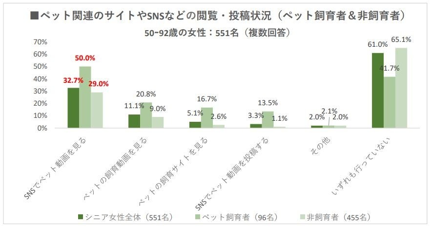 非飼育者を含めたシニア女性全体の 32.7%が SNS でペット動画を視聴。