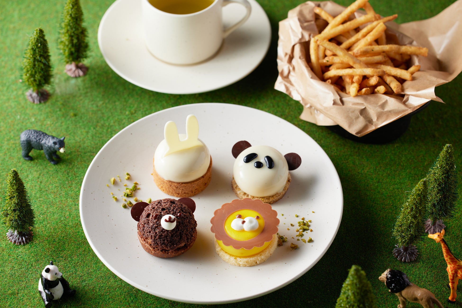 気軽に、またランチ後でもアフタヌーンティーをお楽しみいただけるよう、アイデアを凝らし誕生した新感覚のミニアフタヌーンティーです。くまシュー・パンダムース・ライオンムース・うさぎタルトの4種のスイーツと、サラダもしくはポテトをお召し上がりいただけます。