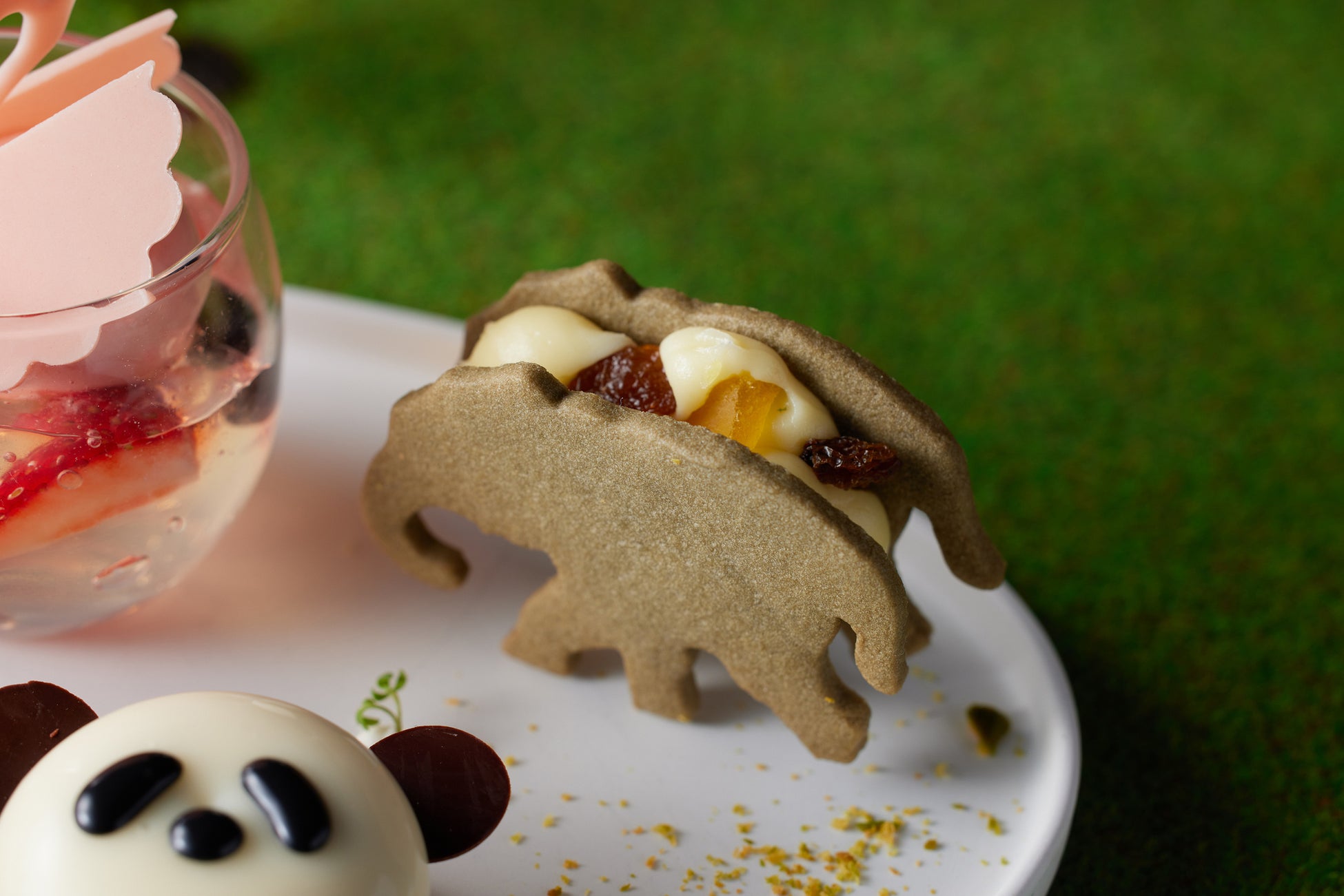 象の胴体の色に近づくよう竹炭で色付けた灰色のクッキーで、イボワールクリームとドライフルーツをサンドした一品です。イボワールクリームの芳醇なバニラの香りが特長の甘さ控えめのクリーミーなホワイトチョコレートクリームで、「イボワール」はフランス語で象牙を意味しています。