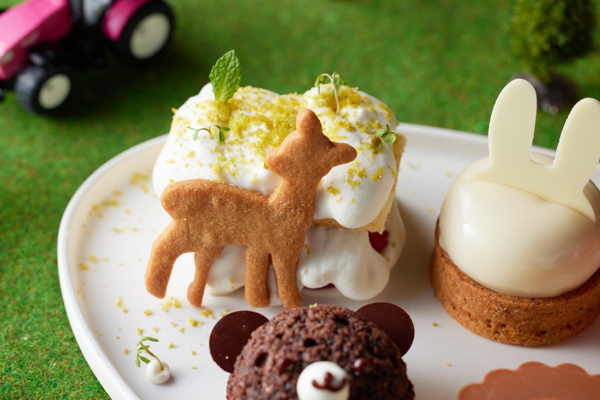 動物たちが暮らす広大な草原をイメージしたショートケーキです。しっとりと焼き上げ、バニラシロップをしみこませたスポンジに苺をサンドし、たっぷりの北海道産生クリームで包みました。ピスタチオとハーブ、草食動物のクッキーをトッピングし、草原感溢れる見た目に仕上げています。