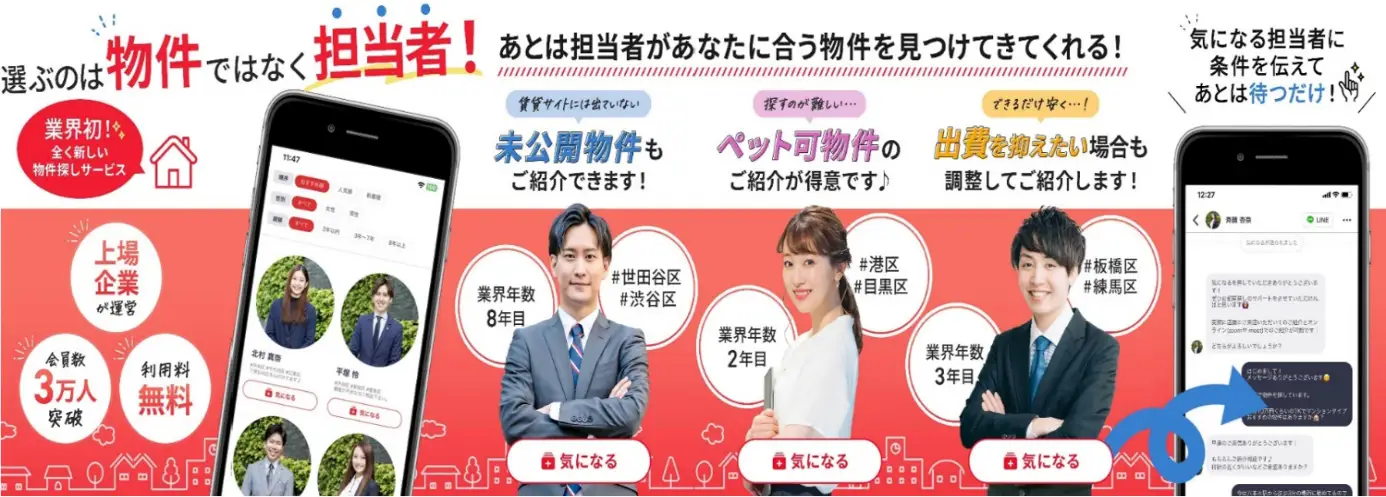 まるでSNSで友人と情報交換をするように、コンシェルジュとお部屋探しができる新感覚のマッチングアプリです。