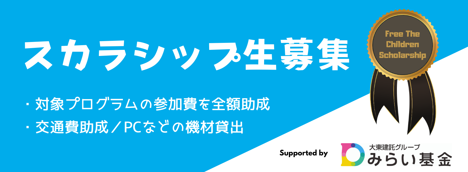 スカラシップ生として選ばれた方に対して、「大東建託グループみらい基金」がフリー・ザ・チルドレン・ジャパン主催のプログラムの参加費を全額助成します。
