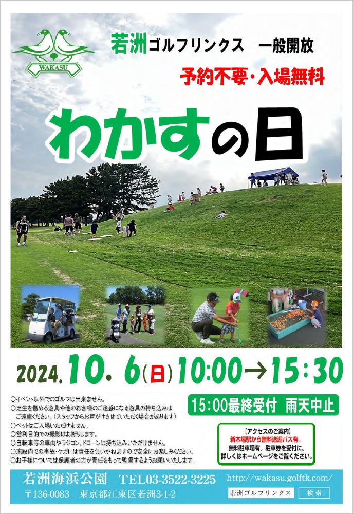 当ゴルフ場は、1965年から1974年までの間にわたり、家庭からの生ゴミなどの廃棄物で埋め立てられた世界で唯一のゴルフ場です。 また、三方を海に囲まれた日本では稀有の美しいロケーションをあわせもつ都民の財産です。そのような若洲ゴルフリンクスの魅力を都民の皆様にご覧いただくことを目的にゴルフ場一般開放デーを開催いたします。