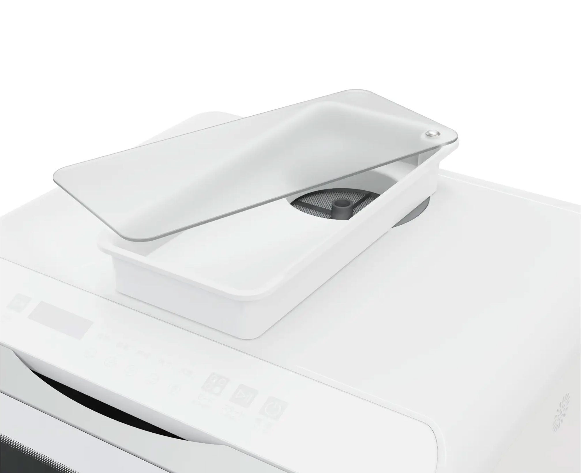 スライドパネルにはフロスト加工を施し、半透明の白色にしているため、水量や汚れを容易に確認することができます。また、スライドパネルによって、給水トレー内への埃やゴミの侵入を防ぐことができます。
