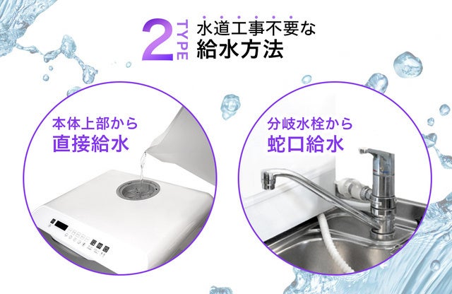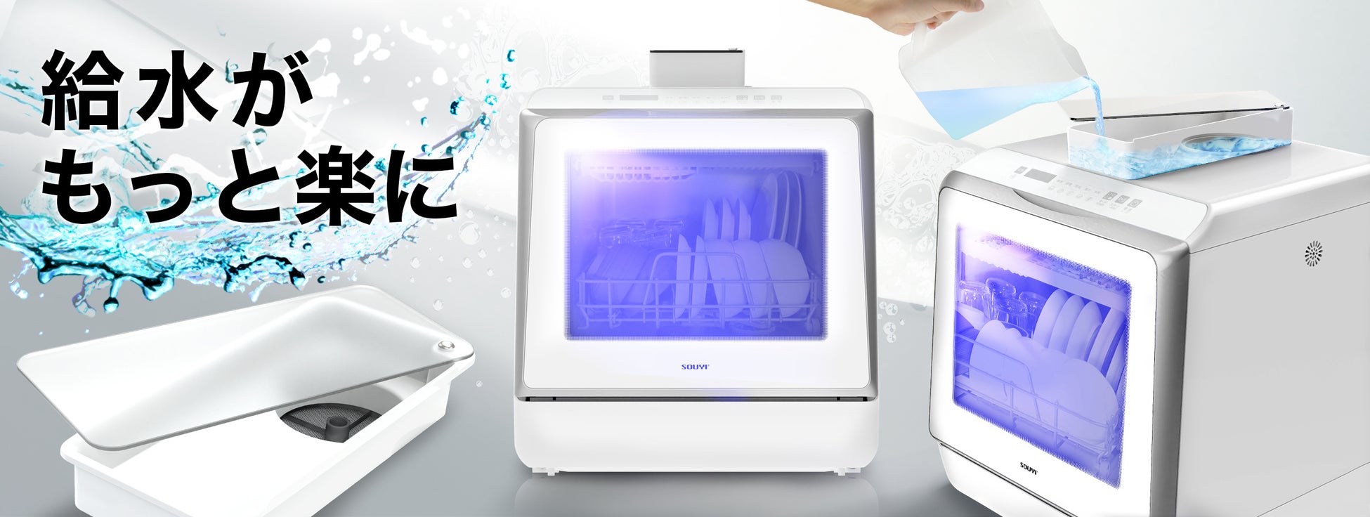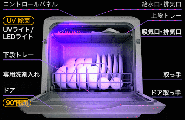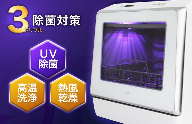 食器洗い乾燥機(UV機能付き) SY-118-UVは、UVランプを搭載した除菌機能付きの食器洗い乾燥機です。また、新製品の給水トレー「SY-118-TR」にも対応しており、取り付けることでさらに使いやすく進化しました。 SY-118-UVは、UVと熱風乾燥によって食器や調理器具を乾かしながら除菌をし、さらに上下に搭載された360°回転する噴射ノズルと温水と水圧の力で、こびりついた頑固な汚れも徹底的に洗浄します。水タンクからの給水も可能なため、水道工事不要で直ぐにご利用いただけます。