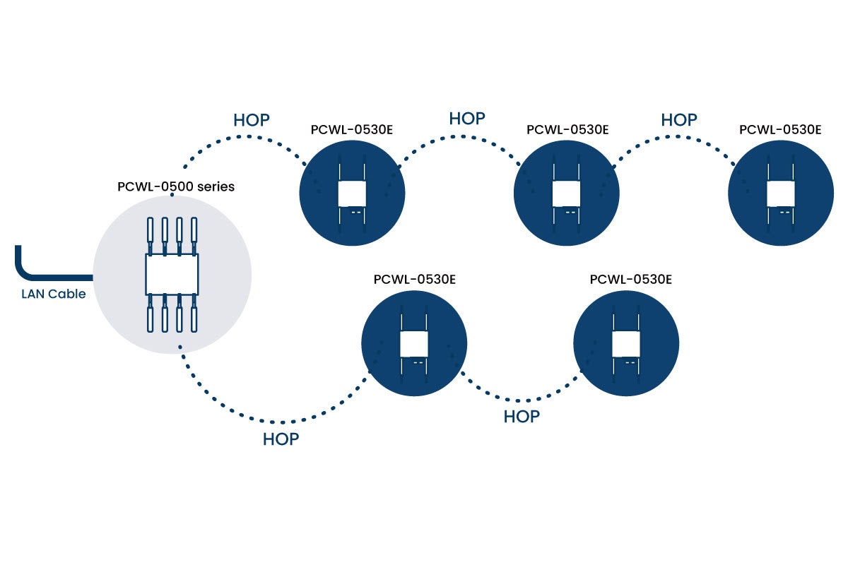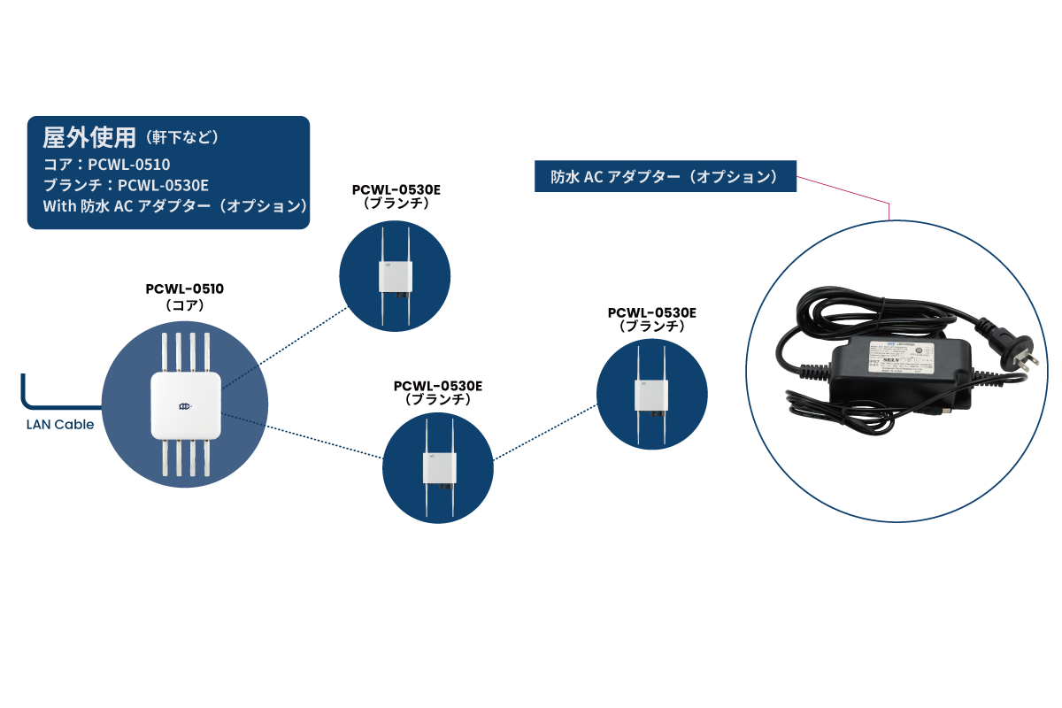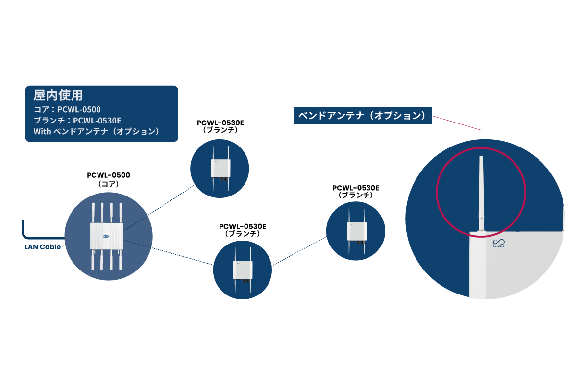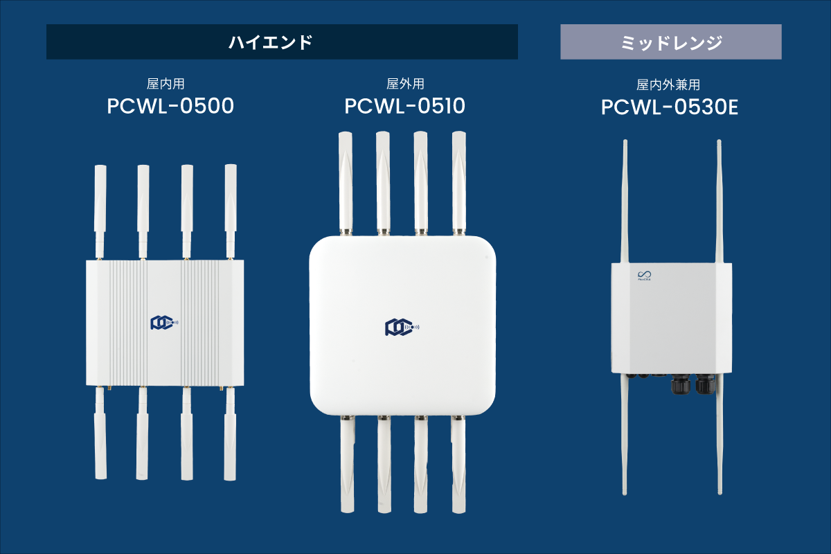 このように、 PCWL-0530Eは、ハイエンドモデルであるPCWL-0500/0510で広域かつハイスピードのWi-Fiアクセスポイントを組み合わせて最適なWiFi通信環境を構築できます。