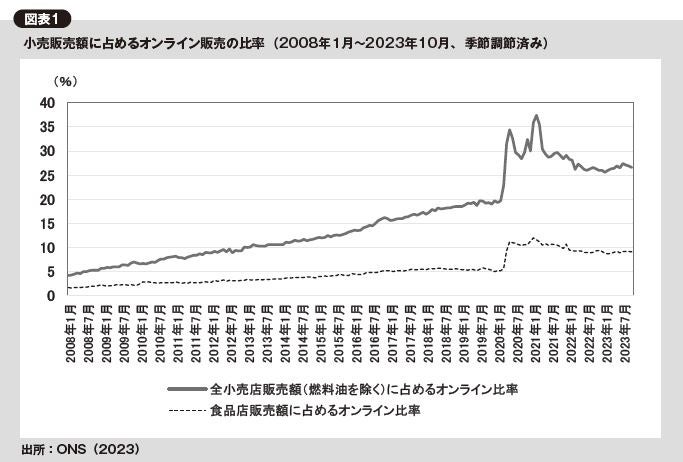 イギリスのネット通販市場では、アマゾンUKがトップを独走する一方、伝統的な実店舗小売業者が店舗網を活用したクリックアンドコレクトによりオンライン販売を拡大してきた。とくにグローサリー分野では、実店舗やダークストアからの配送によるオンライン販売と、実店舗での販売とを組み合わせたオムニチャネルが強みを発揮している。