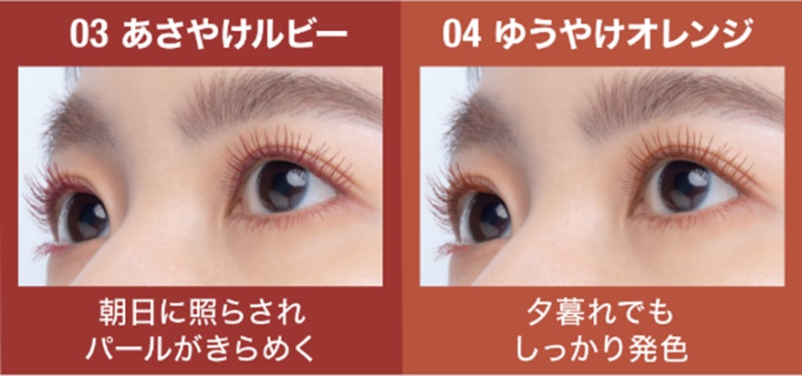 朝日と夕日に染まった空の色をイメージして作られた色味が魅力。朝日に照らされてパールがきらめくような「03 あさやけルビー」と、夕暮れの日差しの中でもしっかり発色する「04 ゆうやけオレンジ」は、儚げなのにしっかり主張するつよカワイイまつ毛を演出します。