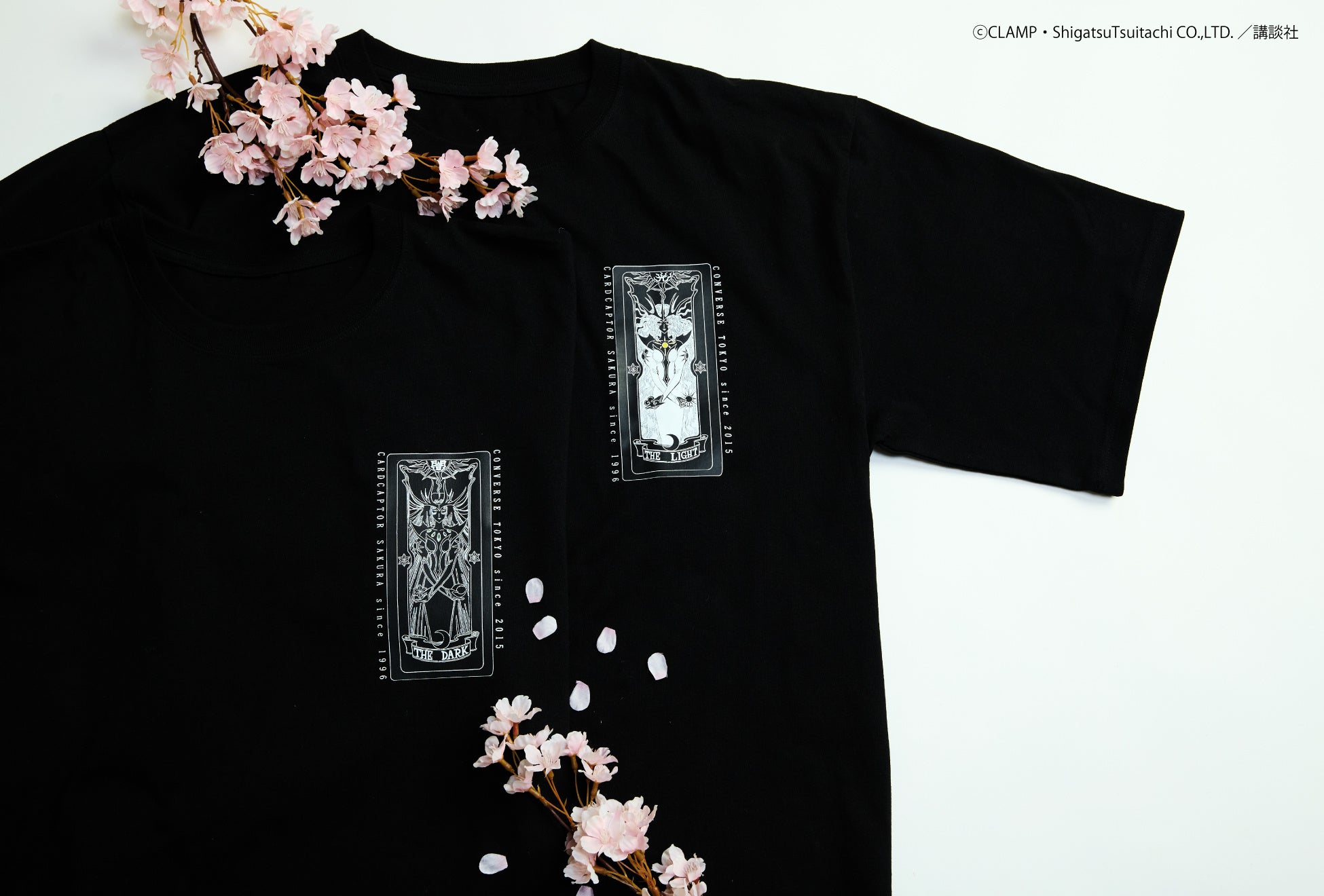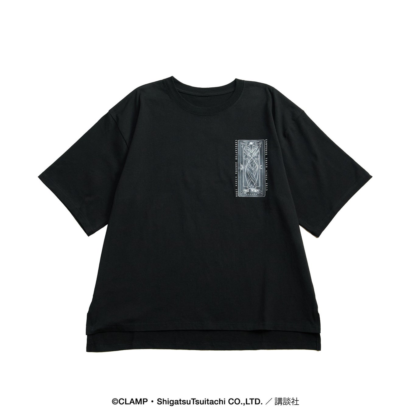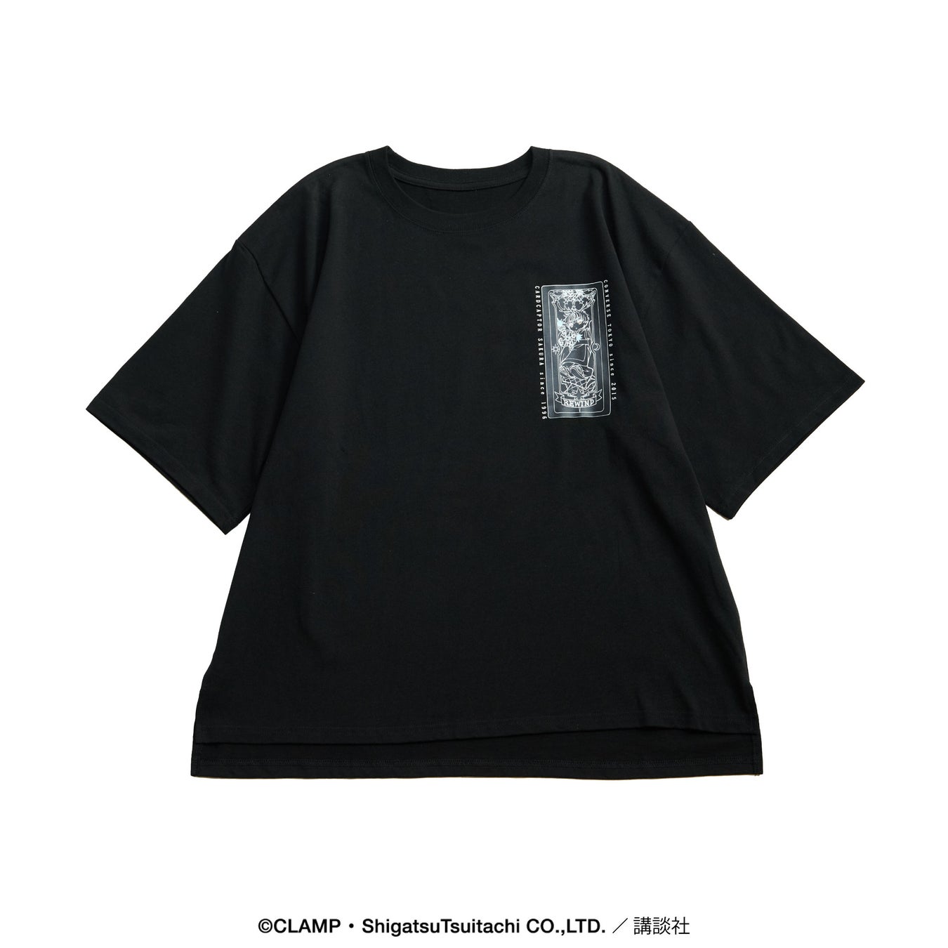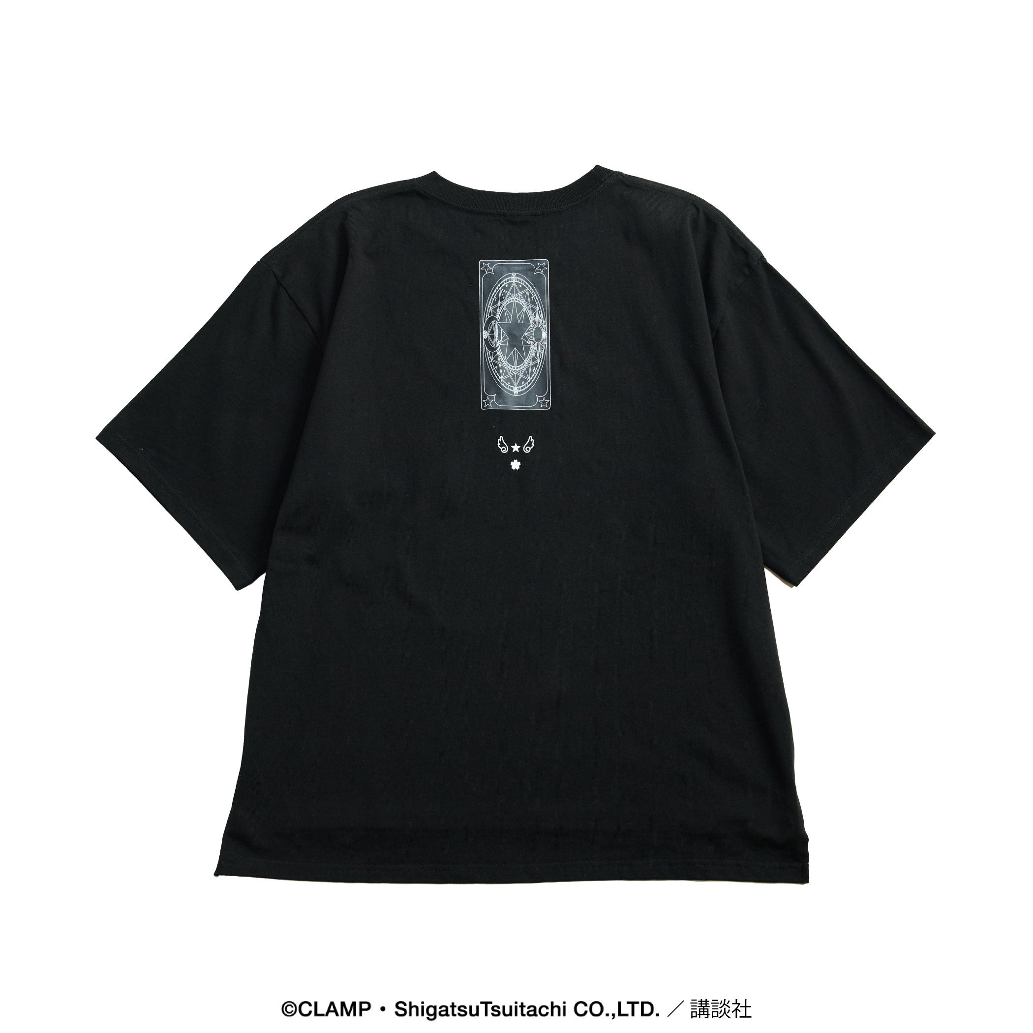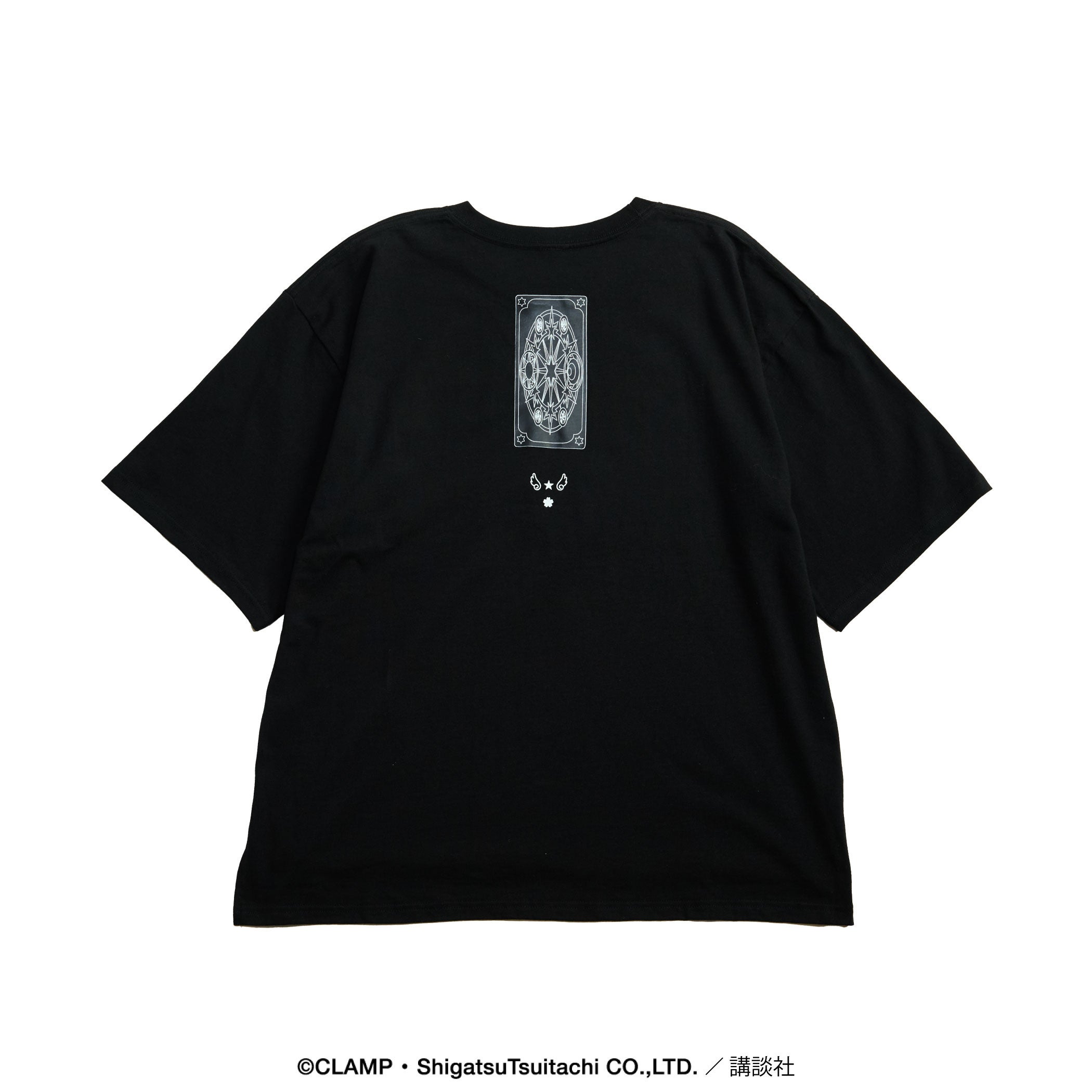 Tシャツは、クロウカードの『光(THE LIGHT)』・『闇(THE DARK)』、さくらカードの『鏡(THE MIRROR)』・『風(THE WINDY)』、クリアカードの『飛翔(FLIGHT)』・『逆戻(REWIND)』をモチーフに展開。胸元にはカードの表面、背面にはカードの裏面のデザインを配し、カードの魔力をその身に纏うような一着に仕上げました。