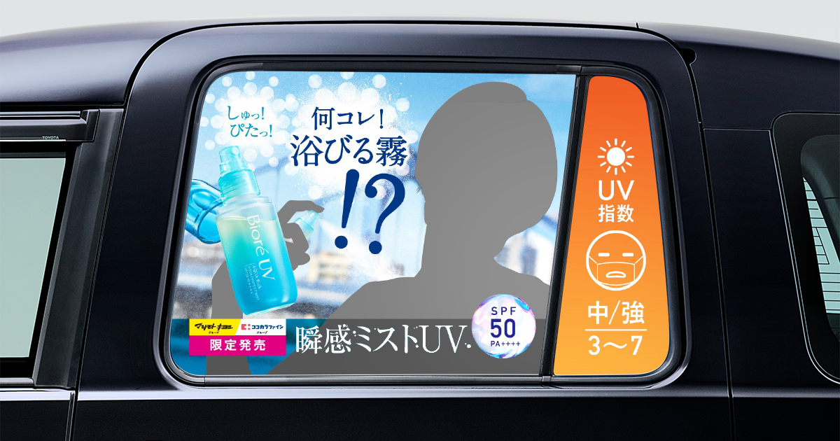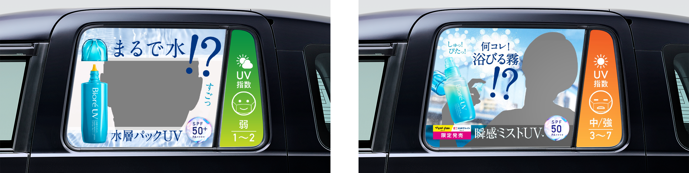 「紫外線情報」には、WxTechサービスの1kmメッシュの「紫外線予報API」を用います。紫外線状況を弱(指数:1〜2)、中/強(指数:3〜7)の2段階で表示し、紫外線状況に応じた広告クリエイティブを日替わりで掲出します。また、車内でも商品動画を放映する他、対象車両に乗車した女性限定で「ビオレUVアクアリッチ アクアプロテクトローション(通称:水層パックUV)」の試供品を配布し、歩行者だけでなくタクシー利用者に対しても紫外線予防を呼びかけます。
