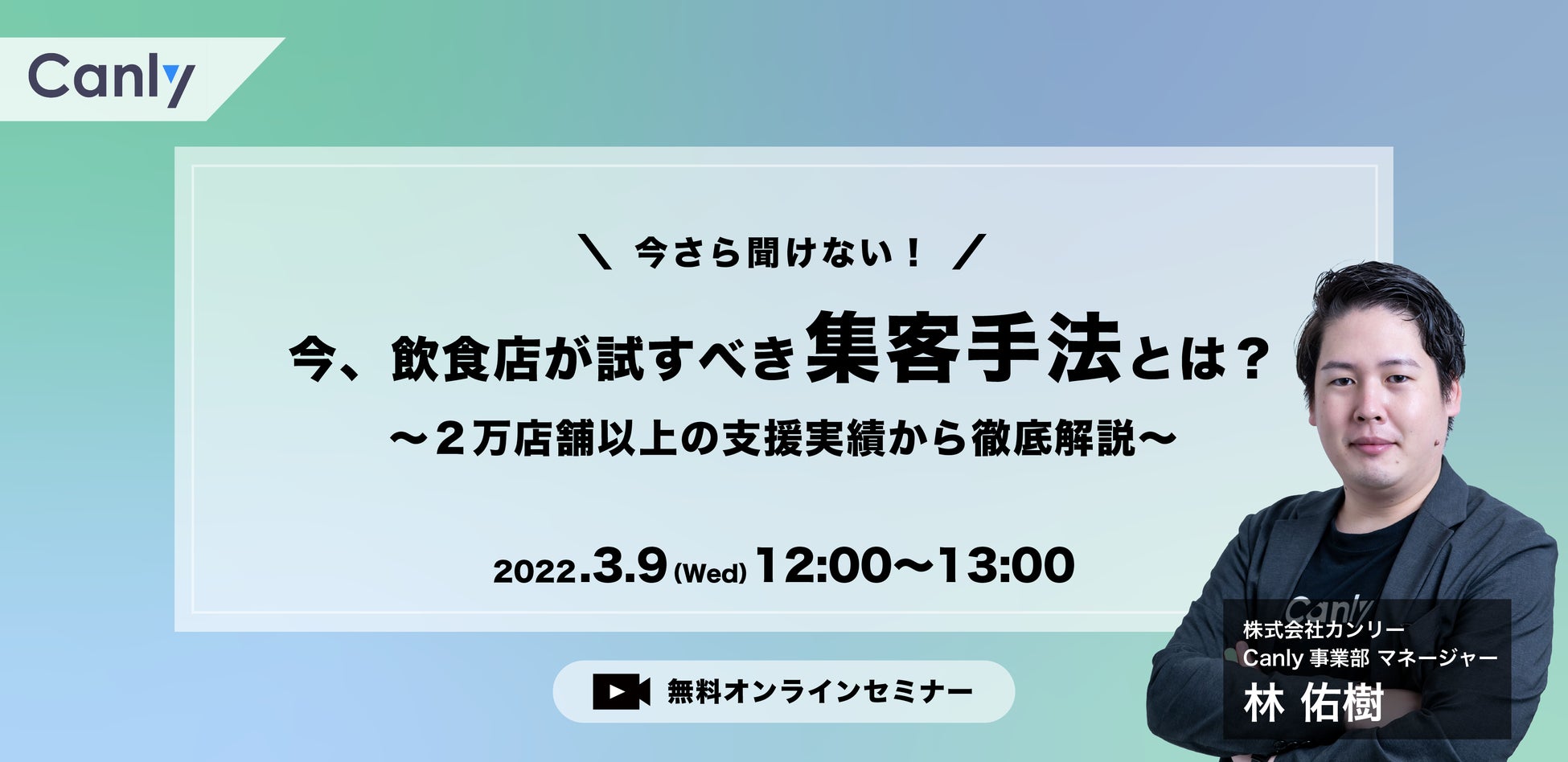 Googleビジネスプロフィール(旧・Googleマイビジネス)・HP・各SNSの一括管理サービス「Canly(カンリー)」の開発・提供を行う株式会社カンリー(所在地:東京都渋谷区、代表取締役:辰巳 衛,秋山 祐太朗)は、2022年3月9日(水)に『今、飲食店が試すべき集客手法とは?〜2万店舗以上の支援実績から徹底解説〜』を開催することとなりましたのでご案内いたします。