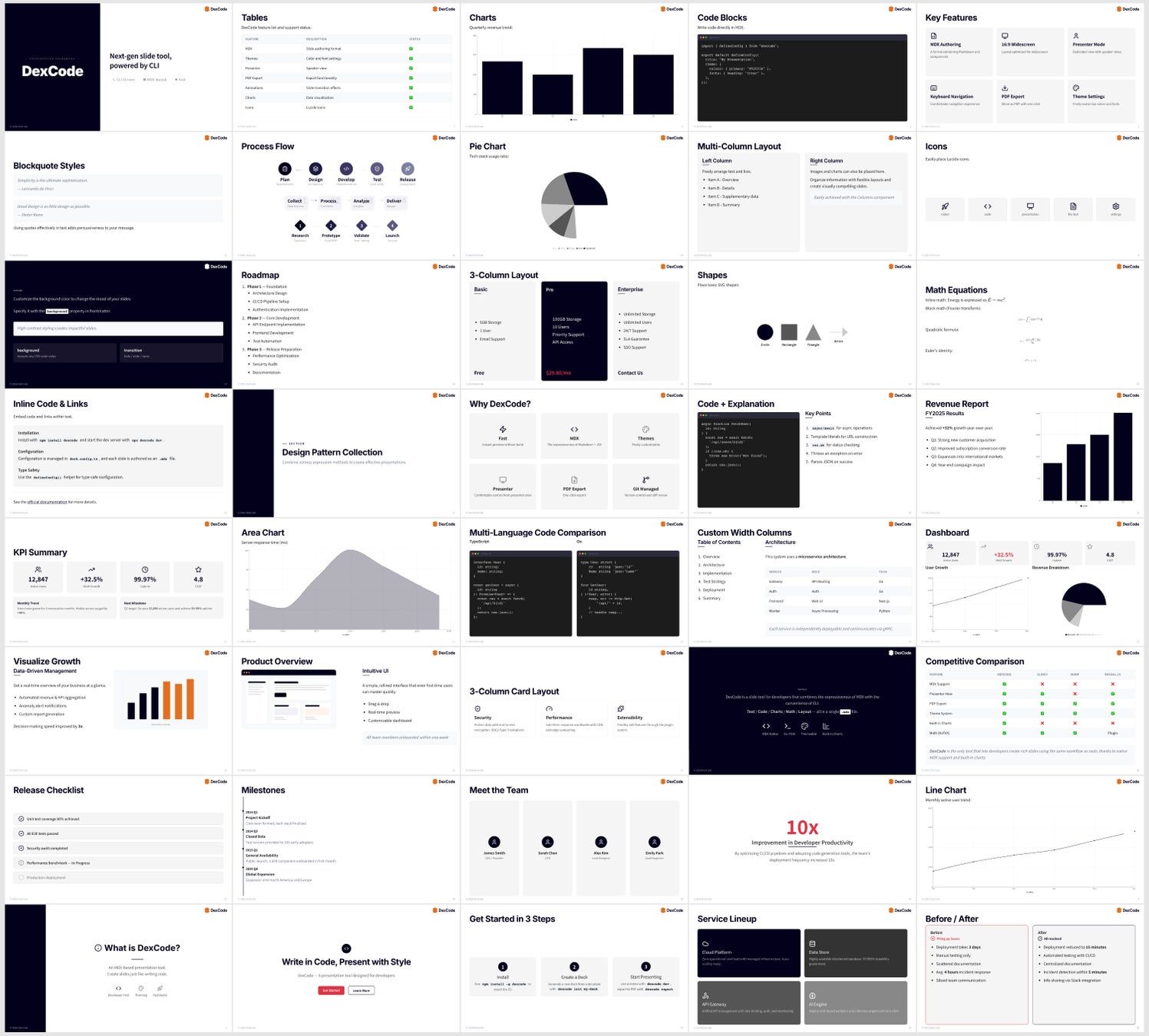 16:9ワイドスクリーン対応の多様なスライドタイプ(カバー、コンテンツ、比較、タイムライン、統計など)を標準搭載。チャート、アイコン、数式、コードブロック、カードレイアウトなど豊富な組み込みコンポーネントにより、技術発表から経営報告まで幅広い用途に対応します。もちろんオリジナルカスタマイズも自由自在です。