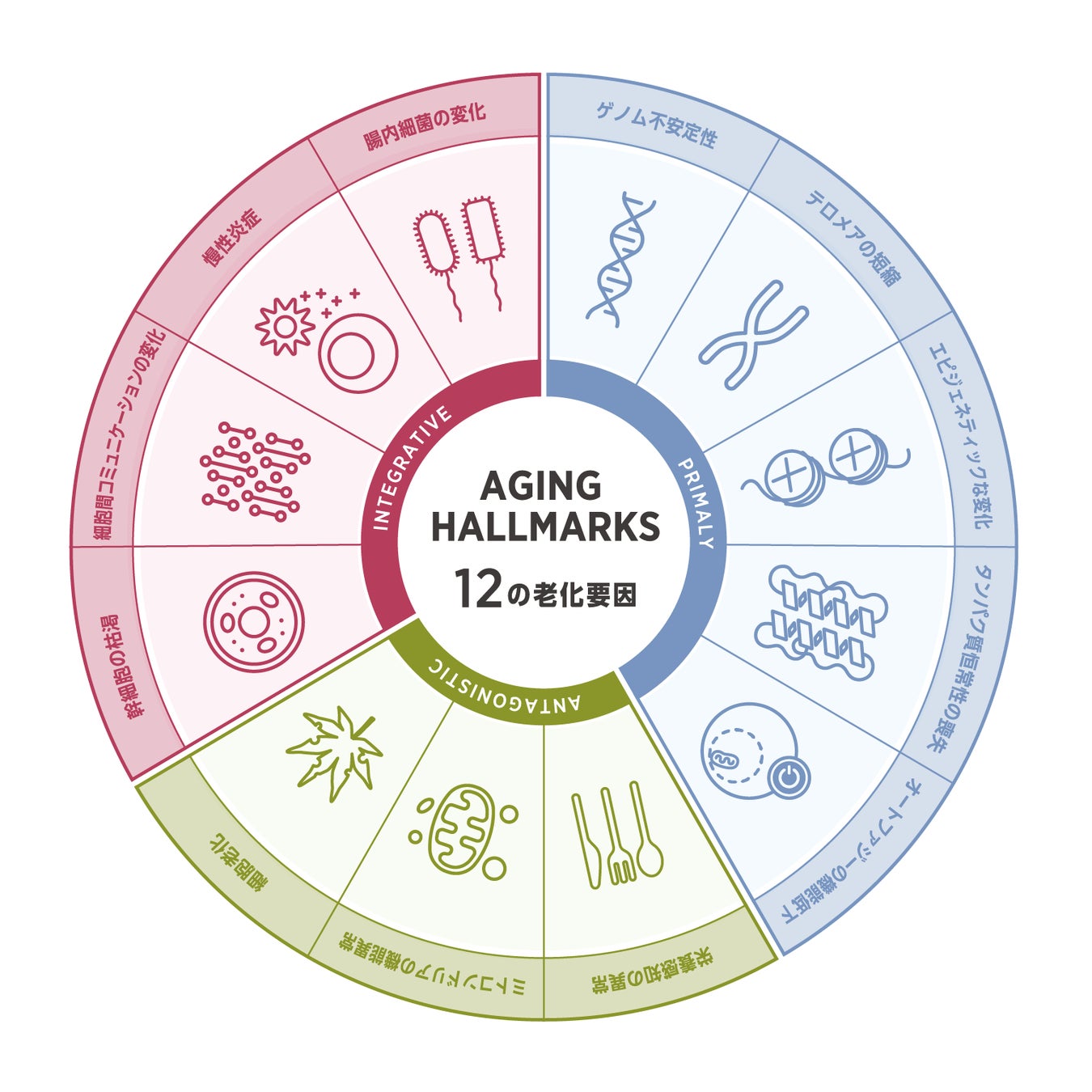 私たち阿部養庵堂薬品は、NMNと和漢素材を掛け合わせ、より包括的なエイジングケアを追求しています。老化の原因とされる「ホールマーク(老化の12因子)」のうち、7〜8項目にアプローチできるのがNMN。さらに、若さを支えるさまざまな成分を加えることで、その効果をさらに高めています。