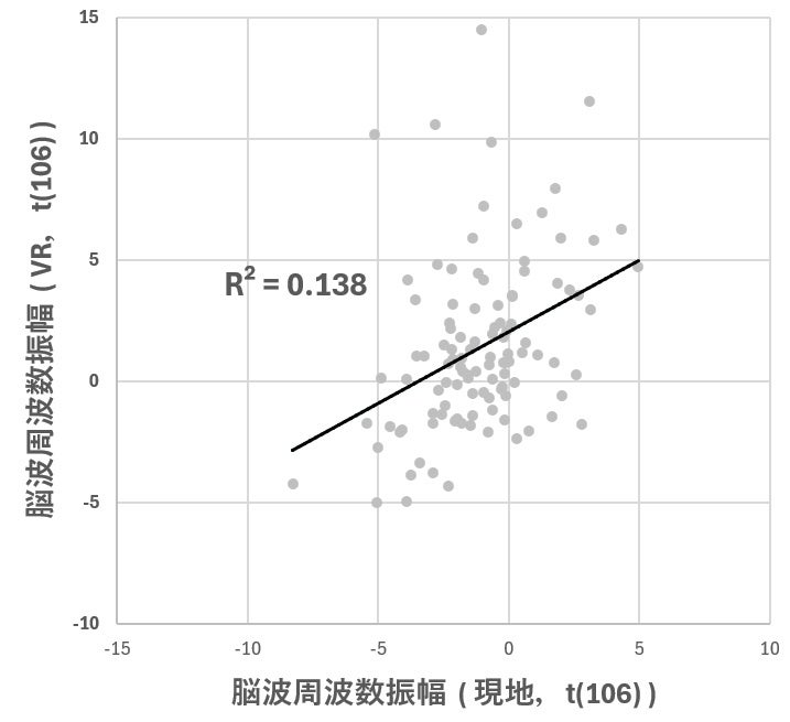 (高精度脳波計の電極12点、計測地点3点、脳波3周波数帯(α波・β波・θ波)での脳波振幅(3名の参加者の平均値(ベースラインからの変動をt値に換算)の各108点を解析。t(106)=4.12, p<0.0001)