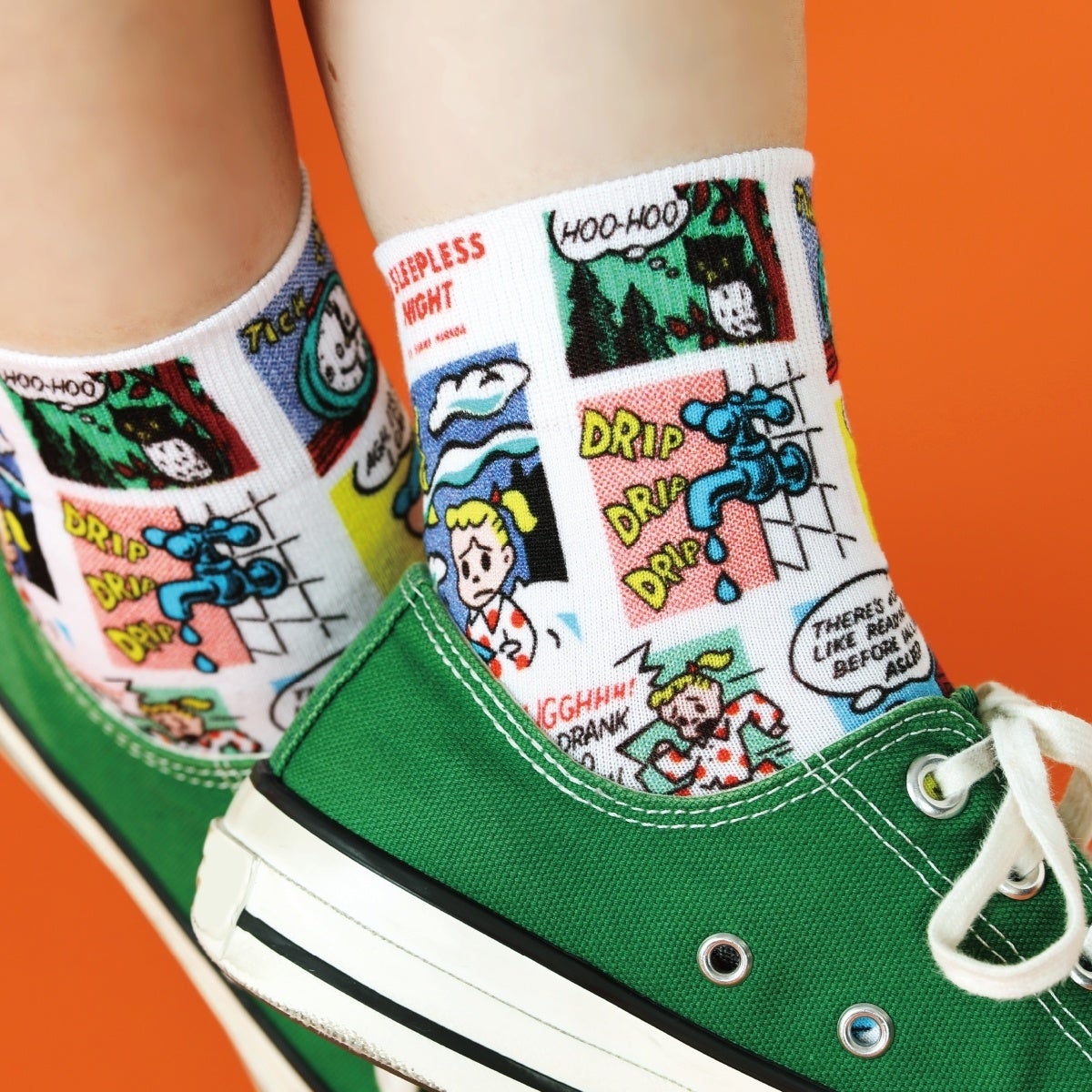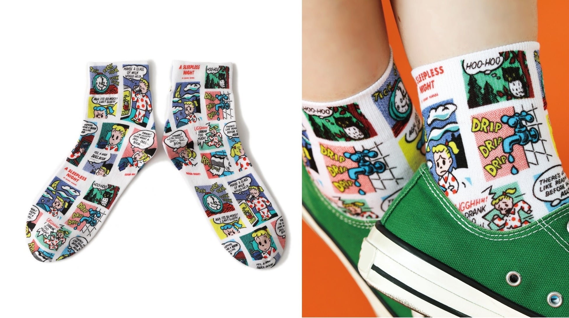 ジルの眠れない夜を描いたコミック調プリントソックス。ポップでビビットな色合いが、コーデのアクセントとして足元を彩ります。