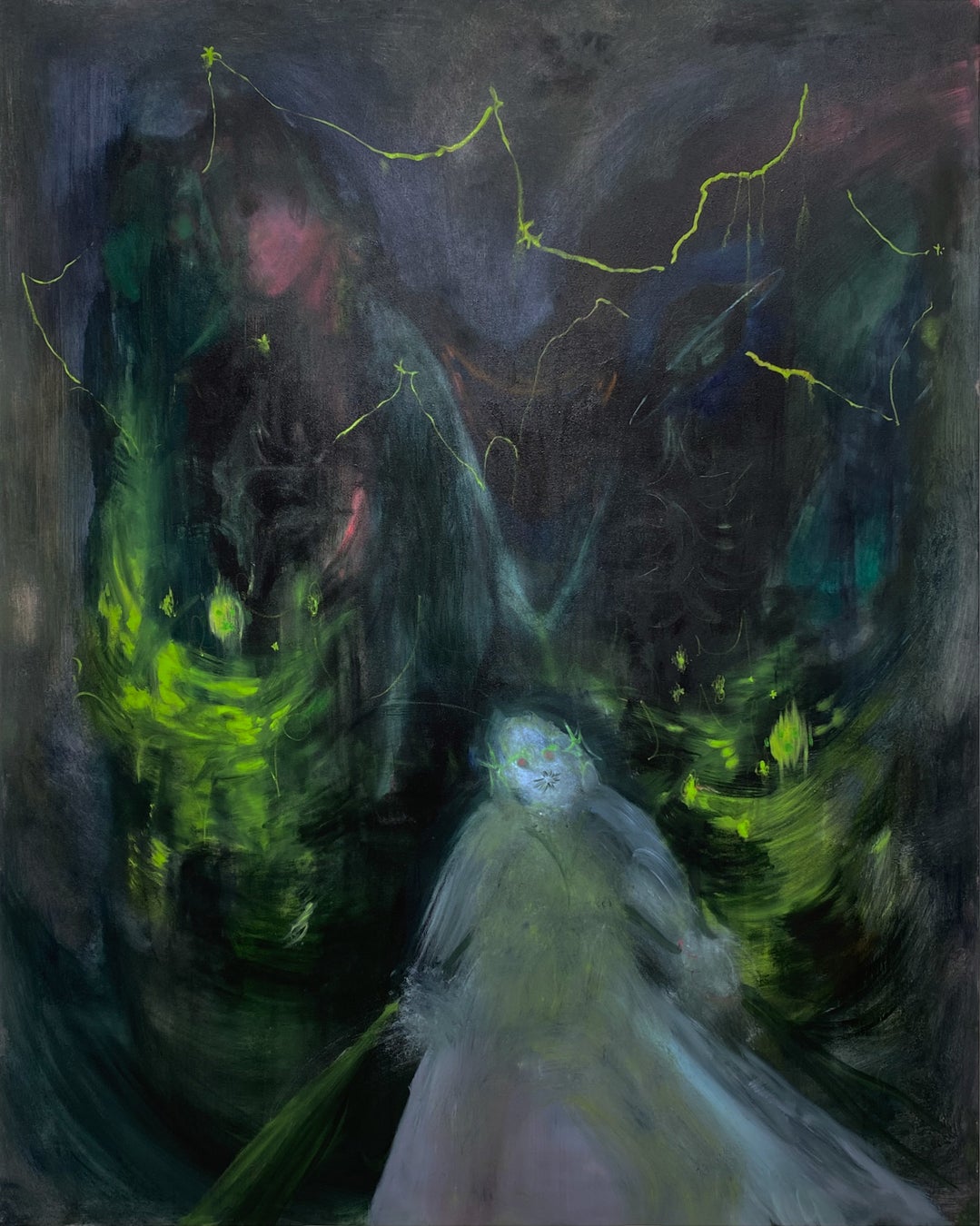 石山の絵画制作のきっかけになっているのは主に”音楽を聴くこと”であり、実在するかわからないミュージシャンをインターネットで見つけては繰り返し聴き、その存在に取り憑かれたように生命を感じさせるイメージを絵画に落とし込み制作をおこなっています。あくまでもベーシックな手法で絵画を描くことで、個人的体験や経験を、絵を描く行為と同化させていくような作家独自の絵画空間を拡張しています。