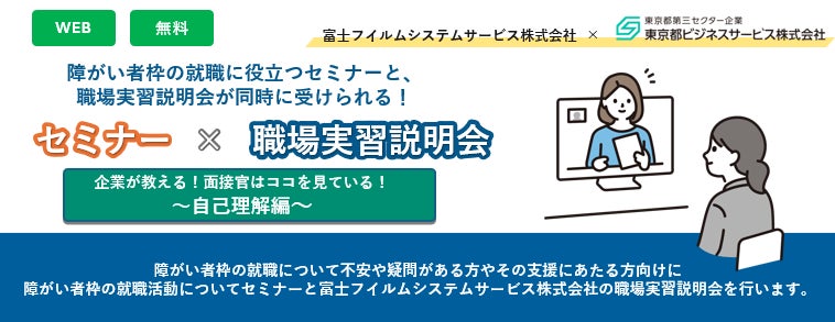 この度、東京都ビジネスサービス株式会社(本社:東京都江東区、代表取締役社長:根津 史明、以下「東京都ビジネスサービス」)は、富士フイルムシステムサービス株式会社(本社:東京都新宿区、代表取締役社長:井上 あまね、以下「富士フイルムシステムサービス」)と連携し、「障がい者就職活動セミナー×職場実習説明会」を開催することとなりましたので、お知らせいたします。