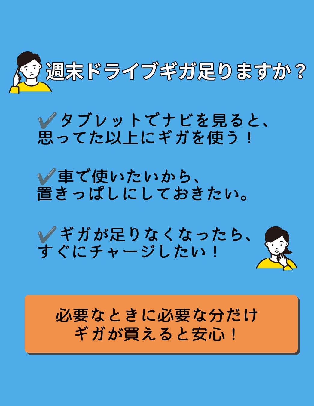 ★週末のドライブにタブレットをナビ代わりに使ったり、動画再生でギガを使う方にお勧めです。