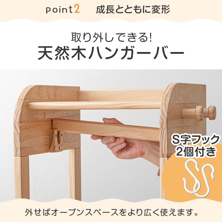 本製品の上部に設置している天然木のハンガーバーは取り外しすることができます。お子様が小さいときは、ハンガーバーを外した状態でオープンスペースとしておむつのストックを収納することができます。
