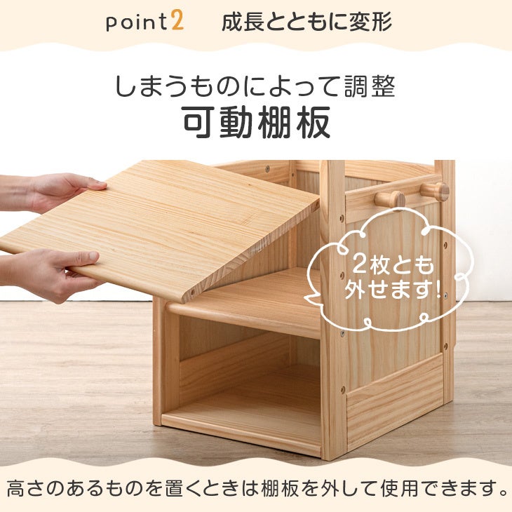 本製品下部に付属している2枚の棚板は取り外し可能で、収納する物の高さに合わせて、棚板の場所を変えることができます。棚板を全て外してハンガーバーのみ取り付けた状態でハンガーラックとして使用することもできるので、お子さまの収納環境の変化に合わせて、本製品の使用スタイルを変えることができるかも本製品の魅力の一つです。