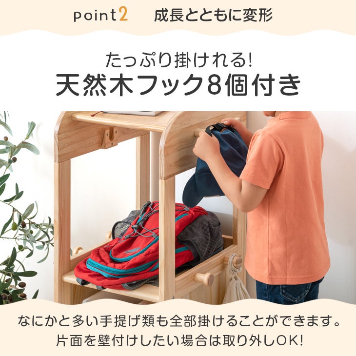 幼稚園・保育園に入園すると、なにかと増える手提げ類も、8個付属している天然木フックで対応可能です。