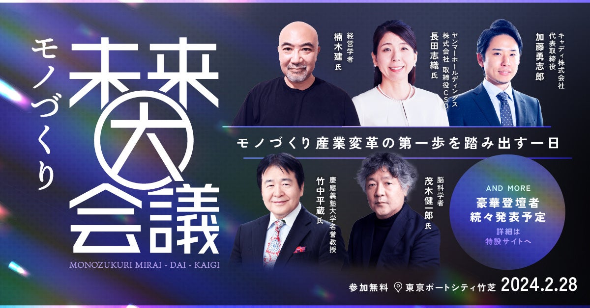 当日は、DXや中小企業の生産性等、"経済成長"の向き合い方を提唱する竹中平蔵氏、AI時代の生き残り方を説く茂木健一郎氏、グローバル観点での競争戦略を論じる経営学者 楠木建氏らを始め、製造業界の第一線で活躍するヤンマーホールディングス取締役CSO 長田志織氏、キャディ代表取締役 加藤勇志郎などの登壇が決定しており、今後も随時追加予定です。