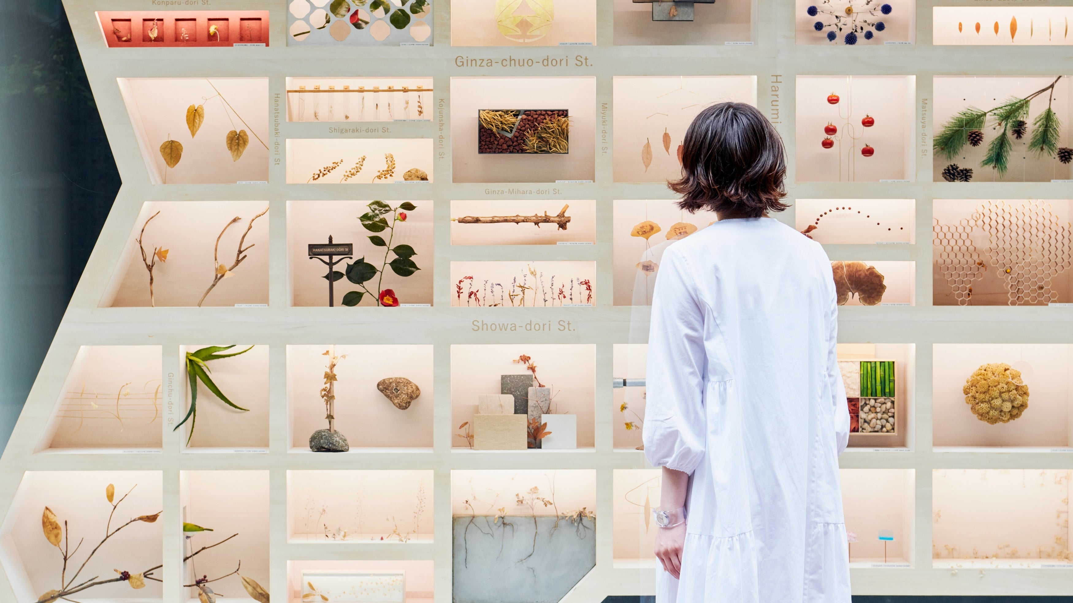 ウィンドウには、銀座の街を模した全72区画の棚を設置し、フィールドワークによって採取した植物や土壌、さらには人の営みにまつわるものを素材にした作品を2021年4月〜2022年4月の期間を通して展示しました。銀座は資生堂の創業の地であり、同じ地域に本社を構える博展と共創し、当プロジェクトを通して、地域とつながるコミュニケーションの活性化を目指しました。