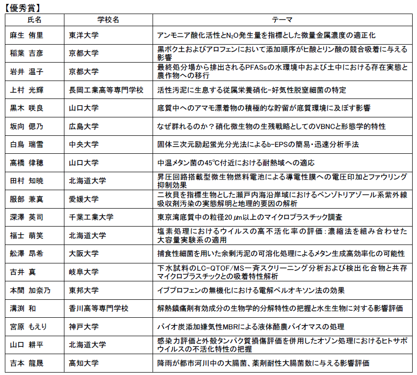 ■第58回 日本水環境学会 年会学生ポスター発表賞「ライオン賞」受賞者・受賞テーマ