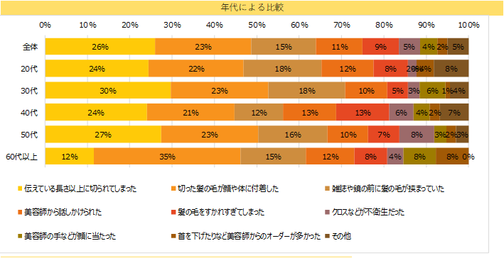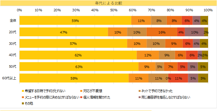 本調査ではこれ以外に、リピートしない美容師は特にどのような美容師かなど全43問で回答を得て、年代別、性別、職業別、既婚・未婚別に集計しています。