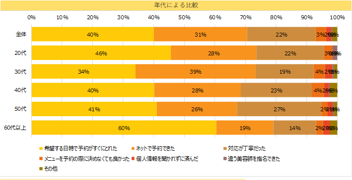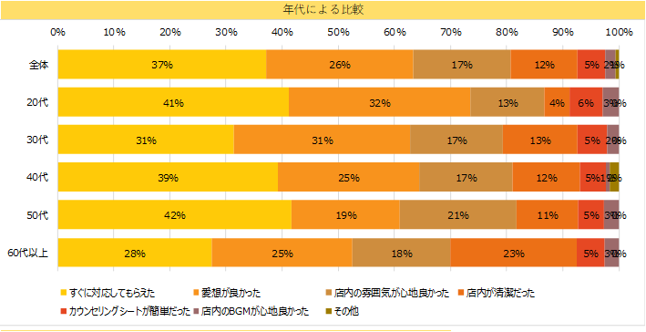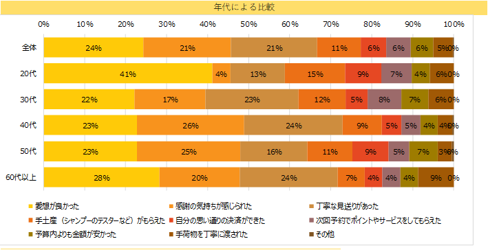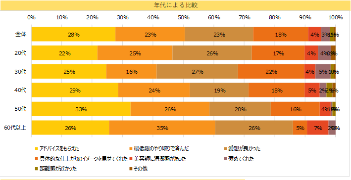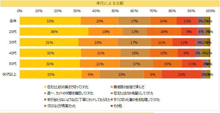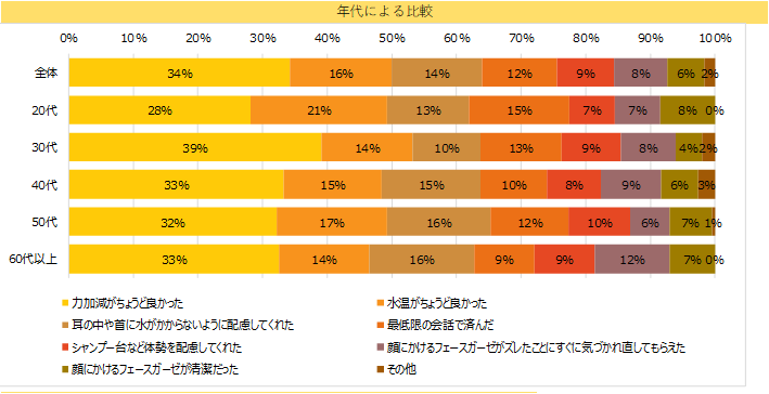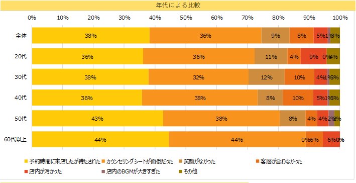 予約時、最も嫌だったこととして「希望する日時で予約が取れなかった」59%、良かった経験は「希望する日時で予約することができた」40%、「ネットで予約できた」31%となりました。実際に来店してからカウンセリングシート記入までの中での悪体験は「案内まで待たされた」が38%、「カウンセリングシートが面倒だった」が36%でした。一方、良体験は「すぐに案内してもらえた」37%でした。美容師と初対面となるカウンセリングでの悪体験は「美容師の態度が馴れ馴れしかった」が最も選択され、良体験においては「アドバイスをもらえた」ことが消費者の心に残っているようです。シャンプーでの悪体験は「耳の中や首に水がかかった」とし、良体験は「力加減がちょうどよかった」。カットでの悪体験は「伝えている長さ以上に切られてしまったこと」、良体験は「伝えたとおりの長さできってくれたこと」でした。施術後からお見送りにおける悪体験は支払いが「予算以上の金額だった」、良体験は「愛想がよかった」でした。
