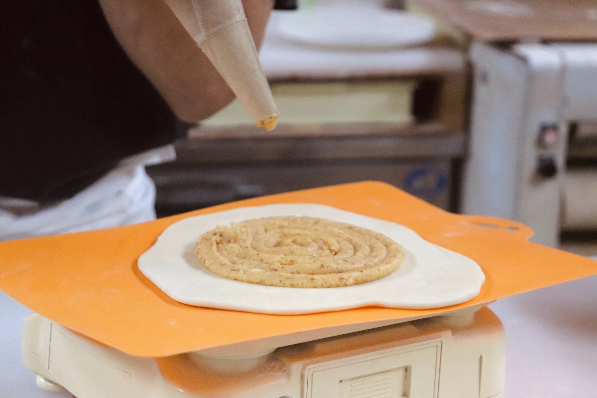 美しさと力強さに隠れた、追及された味の両方を兼ね備えた逸品。表面のつややかかつ濃いめの焼き色の下には、たっぷりのアーモンドクリーム。このクリームは、皮つき、皮なしの両方を作った上で混ぜ合わせるという、通常の倍の手間をかけて作られています。